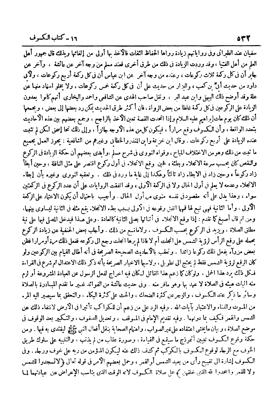 سُفْيَانَ عِنْدَ الطَّبَرَانِيِّ وَفِي رِوَايَاتِهِمْ زِيَادَةٌ رَوَاهَا الْحُفَّاظُ الثِّقَاتُ فَالْأَخْذُ بِهَا أَوْلَى مِنْ إِلْغَائِهَا وَبِذَلِكَ قَالَ جُمْهُورُ أَهْلِ الْعِلْمِ مِنْ أَهْلِ الْفُتْيَا وَقَدْ وَرَدَتِ الزِّيَادَةُ فِي ذَلِكَ مِنْ طُرُقٍ أُخْرَى فَعِنْدَ مُسْلِمٍ مِنْ وَجْهٍ آخَرَ عَنْ عَائِشَةَ وَآخَرَ عَنْ جَابِرٍ أَنَّ فِي كُلِّ رَكْعَةٍ ثَلَاثَ رُكُوعَاتٍ وَعِنْدَهُ مِنْ وَجْهٍ آخر عَن بن عَبَّاسٍ أَنَّ فِي كُلِّ رَكْعَةٍ أَرْبَعَ رُكُوعَاتٍ وَلِأَبِي دَاوُدَ مِنْ حَدِيثِ أُبَيِّ بْنِ كَعْبٍ وَالْبَزَّارِ مِنْ حَدِيثِ عَلِيٍّ أَنَّ فِي كُلِّ رَكْعَةٍ خَمْسَ رُكُوعَاتٍ وَلَا يَخْلُو إِسْنَادٌ مِنْهَا عَن عِلّة وَقد أوضح ذَلِك الْبَيْهَقِيّ وبن عَبْدِ الْبَرِّ وَنَقَلَ صَاحِبُ الْهُدَى عَنِ الشَّافِعِيِّ وَأَحْمَدَ وَالْبُخَارِيِّ أَنَّهُمْ كَانُوا يَعُدُّونَ الزِّيَادَةَ عَلَى الرُّكُوعَيْنِ فِي كُلِّ رَكْعَةٍ غَلَطًا مِنْ بَعْضِ الرُّوَاةِ فَإِنَّ أَكْثَرَ طُرُقِ الْحَدِيثِ يُمْكِنُ رَدُّ بَعْضهَا إِلَى بعض ويجمعها أَنَّ ذَلِكَ كَانَ يَوْمَ مَاتَ إِبْرَاهِيمُ عَلَيْهِ السَّلَام وَإِذا اتّحدت الْقِصَّة تَعَيَّنَ الْأَخْذُ بِالرَّاجِحِ وَجَمَعَ بَعْضُهُمْ بَيْنَ هَذِهِ الْأَحَادِيثِ بِتَعَدُّدِ الْوَاقِعَةِ وَأَنَّ الْكُسُوفَ وَقَعَ مِرَارًا فَيَكُونُ كُلٌّ مِنْ هَذِهِ الْأَوْجُهِ جَائِزًا وَإِلَى ذَلِكَ نَحَا إِسْحَاقُ لَكِنْ لَمْ تَثْبُتْ عِنْدَهُ الزِّيَادَة على أَربع ركوعات وَقَالَ بن خُزَيْمَة وبن الْمُنْذِرِ وَالْخَطَّابِيُّ وَغَيْرُهُمْ مِنَ الشَّافِعِيَّةِ يَجُوزُ الْعَمَلُ بِجَمِيعِ مَا ثَبَتَ مِنْ ذَلِكَ وَهُوَ مِنَ الِاخْتِلَافِ الْمُبَاحِ وَقَوَّاهُ النَّوَوِيُّ فِي شَرْحِ مُسْلِمٍ وَأَبْدَى بَعْضُهُمْ أَنَّ حِكْمَةَ الزِّيَادَةِ فِي الرُّكُوعِ وَالنَّقْصِ كَانَ بِحَسَبِ سُرْعَةِ الِانْجِلَاءِ وَبُطْئِهِ فَحِينَ وَقَعَ الِانْجِلَاءُ فِي أَوَّلِ رُكُوعٍ اقْتَصَرَ عَلَى مِثْلِ النَّافِلَةِ وَحِينَ أَبْطَأَ زَادَ رُكُوعًا وَحِينَ زَادَ فِي الْإِبْطَاءِ زَادَ ثَالِثًا وَهَكَذَا إِلَى غَايَةِ مَا وَرَدَ فِي ذَلِكَ وَتَعَقَّبَهُ النَّوَوِيُّ وَغَيْرُهُ بِأَنَّ إِبْطَاءَ الِانْجِلَاءِ وَعَدَمَهُ لَا يُعْلَمُ فِي أَوَّلِ الْحَالِ وَلَا فِي الرَّكْعَةِ الْأُولَى وَقَدِ اتَّفَقَتِ الرِّوَايَاتُ عَلَى أَنَّ عَدَدَ الرُّكُوعِ فِي الرَّكْعَتَيْنِ سَوَاءٌ وَهَذَا يَدُلُّ عَلَى أَنَّهُ مَقْصُودٌ فِي نَفْسِهِ مَنْوِيٌّ مِنْ أَوَّلِ الْحَالِ وَأُجِيبَ بِاحْتِمَالِ أَنْ يَكُونَ الِاعْتِمَادُ عَلَى الرَّكْعَةِ الْأُولَى وَأَمَّا الثَّانِيَةُ فَهِيَ تَبَعٌ لَهَا فَمَهْمَا اتَّفَقَ وُقُوعُهُ فِي الْأُولَى بِسَبَبِ بُطْءِ الِانْجِلَاءِ يَقَعُ مِثْلُهُ فِي الثَّانِيَةِ لِيُسَاوِيَ بَيْنَهُمَا وَمِنْ ثَمَّ قَالَ أَصْبَغُ كَمَا تَقَدَّمَ إِذَا وَقَعَ الِانْجِلَاءُ فِي أَثْنَائِهَا يُصَلِّي الثَّانِيَةَ كَالْعَادَةِ وَعَلَى هَذَا فَيَدْخُلُ الْمُصَلِّي فِيهَا عَلَى نِيَّةِ مُطْلَقِ الصَّلَاةِ وَيَزِيدُ فِي الرُّكُوعِ بِحَسَبِ الْكُسُوفِ وَلَا مَانِعَ مِنْ ذَلِكَ وَأَجَابَ بَعْضُ الْحَنَفِيَّةِ عَنْ زِيَادَةِ الرُّكُوعِ بِحَمْلِهِ عَلَى رَفْعِ الرَّأْسِ لِرُؤْيَةِ الشَّمْسِ هَلِ انْجَلَتْ أَمْ لَا فَإِذَا لَمْ يَرَهَا انْجَلَتْ رَجَعَ إِلَى رُكُوعِهِ فَفَعَلَ ذَلِكَ مَرَّةً أَوْ مِرَارًا فَظَنَّ بَعْضَ مَنْ رَآهُ يَفْعَلُ ذَلِكَ رُكُوعًا زَائِدًا وَتُعُقِّبَ بِالْأَحَادِيثِ الصَّحِيحَةِ الصَّرِيحَةِ فِي أَنَّهُ أَطَالَ الْقِيَامَ بَيْنَ الرُّكُوعَيْنِ وَلَوْ كَانَ الرَّفْعُ لِرُؤْيَةِ الشَّمْسِ فَقَطْ لَمْ يَحْتَجْ إِلَى تَ