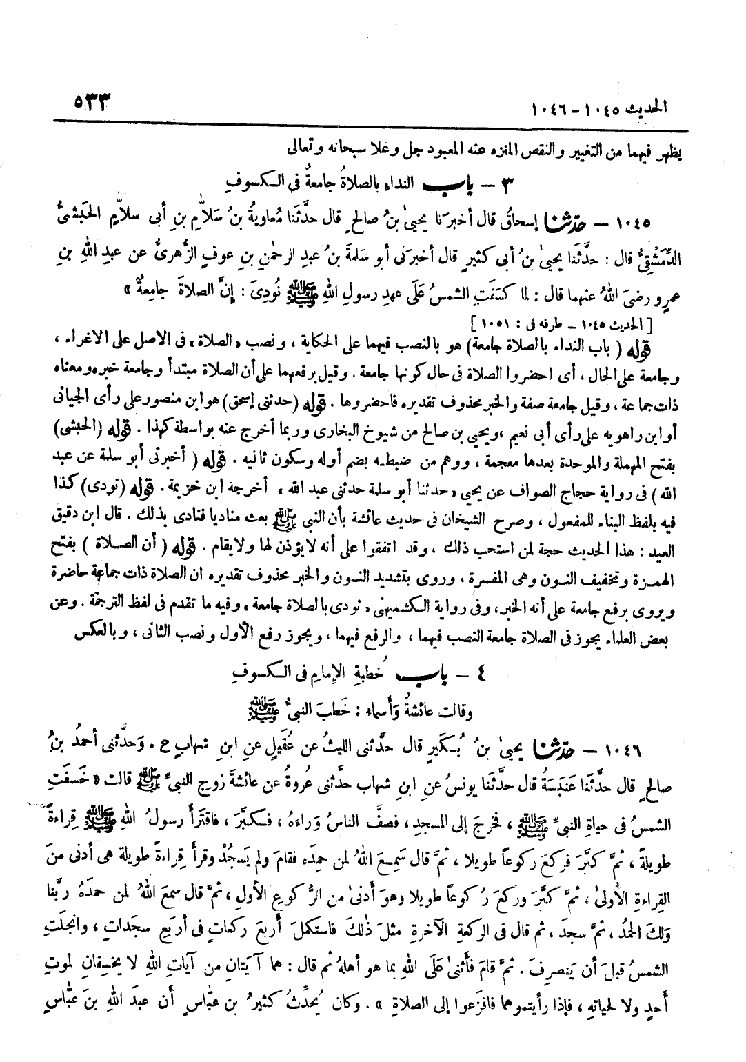 [1045] قَوْله حَدثنِي إِسْحَاق هُوَ بن مَنْصُور على رأى الجياني أَو بن رَاهَوَيْه على رأى أبي نعيم وَيحيى بن صَالِحٍ مِنْ شُيُوخِ الْبُخَارِيِّ وَرُبَّمَا أَخْرَجَ عَنْهُ بِوَاسِطَةٍ كَهَذَا قَوْلُهُ الْحَبَشِيُّ بِفَتْحِ الْمُهْمَلَةِ وَالْمُوَحَّدَةِ بَعْدَهَا مُعْجَمَةٌ وَوَهِمَ مَنْ ضَبَطَهُ بِضَمِّ أَوَّلِهِ وَسُكُونِ ثَانِيهِ قَوْلُهُ أَخْبَرَنِي أَبُو سَلَمَةَ عَنْ عَبْدِ اللَّهِ فِي رِوَايَةِ حَجَّاجٍ الصَّوَافِ عَنْ يَحْيَى حَدَّثَنَا أَبُو سَلَمَةَ حَدَّثَنِي عَبْدُ اللَّهِ أخرجه بن خُزَيْمَةَ قَوْلُهُ نُودِيَ كَذَا فِيهِ بِلَفْظِ الْبِنَاءِ لِلْمَفْعُولِ وَصَرَّحَ الشَّيْخَانِ فِي حَدِيثِ عَائِشَةَ بِأَنَّ النَّبِيَّ صَلَّى اللَّهُ عَلَيْهِ وَسَلَّمَ بَعَثَ مُنَادِيًا فَنَادَى بذلك قَالَ بن دَقِيقِ الْعِيدِ هَذَا الْحَدِيثُ حُجَّةٌ لِمَنِ اسْتَحَبَّ ذَلِكَ وَقَدِ اتَّفَقُوا عَلَى أَنَّهُ لَا يُؤَذَّنُ لَهَا وَلَا يُقَامُ قَوْلُهُ أَنَّ الصَّلَاةَ بِفَتْحِ الْهَمْزَةِ وَتَخْفِيفِ النُّونِ وَهِيَ الْمُفَسِّرَةُ وَرُوِيَ بِتَشْدِيدِ النُّونِ وَالْخَبَرُ مَحْذُوفٌ تَقْدِيرُهُ أَنَّ الصَّلَاةَ ذَاتُ جَمَاعَةٍ حَاضِرَةٍ وَيُرْوَى بِرَفْعِ جَامِعَةٍ عَلَى أَنَّهُ الْخَبَرُ وَفِي رِوَايَةِ الْكُشْمِيهَنِيِّ نُودِيَ بِالصَّلَاةِ جَامِعَةٌ وَفِيهِ مَا تَقَدَّمَ فِي لَفْظِ التَّرْجَمَةِ وَعَنْ بَعْضِ الْعُلَمَاءِ يَجُوزُ فِي الصَّلَاةِ جَامِعَةٌ النَّصْبُ فِيهِمَا وَالرَّفْعُ فِيهِمَا وَيَجُوزُ رَفْعُ الْأَوَّلِ وَنَصْبُ الثَّانِي وَبِالْعَكْسِ