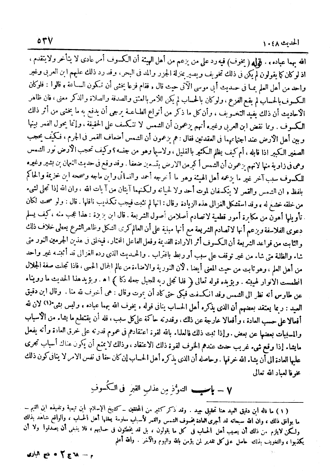 اللَّهُ بِهِمَا عِبَادَهُ قَوْلُهُ يُخَوِّفُ فِيهِ رَدٌّ عَلَى مَنْ يَزْعُمُ مِنْ أَهْلِ الْهَيْئَةِ أَنَّ الْكُسُوفَ أَمْرٌ عَادِيٌّ لَا يَتَأَخَّرُ وَلَا يَتَقَدَّمُ إِذْ لَوْ كَانَ كَمَا يَقُولُونَ لَمْ يَكُنْ فِي ذَلِكَ تَخْوِيفٌ وَيَصِيرُ بِمَنْزِلَةِ الْجَزْرِ وَالْمَدِّ فِي الْبَحْر وَقد رد ذَلِك عَلَيْهِم بن الْعَرَبِيِّ وَغَيْرُ وَاحِدٍ مِنْ أَهْلِ الْعِلْمِ بِمَا فِي حَدِيثِ أَبِي مُوسَى الْآتِي حَيْثُ قَالَ فَقَامَ فَزِعًا يَخْشَى أَنْ تَكُونَ السَّاعَةَ قَالُوا فَلَوْ كَانَ الْكُسُوفُ بِالْحِسَابِ لَمْ يَقَعِ الْفَزَعُ وَلَوْ كَانَ بِالْحِسَابِ لَمْ يَكُنْ لِلْأَمْرِ بِالْعِتْقِ وَالصَّدَقَةِ وَالصَّلَاةِ وَالذِّكْرِ مَعْنًى فَإِنَّ ظَاهِرَ الْأَحَادِيثِ أَنَّ ذَلِكَ يُفِيدُ التَّخْوِيفَ وَأَنَّ كُلَّ مَا ذُكِرَ مِنْ أَنْوَاعِ الطَّاعَةِ يُرْجَى أَنْ يُدْفَعَ بِهِ مَا يُخْشَى مِنْ أَثَرِ ذَلِكَ الْكُسُوفِ وَمِمَّا نقض بن الْعَرَبِيِّ وَغَيْرُهُ أَنَّهُمْ يَزْعُمُونَ أَنَّ الشَّمْسَ لَا تَنْكَسِفُ عَلَى الْحَقِيقَةِ وَإِنَّمَا يَحُولُ الْقَمَرُ بَيْنَهَا وَبَيْنَ أَهْلِ الْأَرْضِ عِنْدَ اجْتِمَاعِهِمَا فِي الْعُقْدَتَيْنِ فَقَالَ هُمْ يَزْعُمُونَ أَنَّ الشَّمْسَ أَضْعَافُ الْقَمَرِ فِي الْجِرْمِ فَكَيْفَ يَحْجُبُ الصَّغِيرُ الْكَبِيرَ إِذَا قَابَلَهُ أَمْ كَيْفَ يُظْلَمُ الْكَثِيرُ بِالْقَلِيلِ وَلَا سِيَّمَا وَهُوَ مِنْ جِنْسِهِ وَكَيْفَ تَحْجُبُ الْأَرْضُ نُورَ الشَّمْسِ وَهِيَ فِي زَاوِيَةٍ مِنْهَا لِأَنَّهُمْ يَزْعُمُونَ أَنَّ الشَّمْسَ أَكْبَرُ مِنَ الْأَرْضِ بِتِسْعِينَ ضِعْفًا وَقَدْ وَقَعَ فِي حَدِيثِ النُّعْمَانِ بْنِ بَشِيرٍ وَغَيْرِهِ لِلْكُسُوفِ سَبَبٌ آخَرُ غَيْرُ مَا يَزْعُمُهُ أَهْلُ الْهَيْئَةِ وَهُوَ مَا أَخْرَجَهُ أَحْمَدُ وَالنَّسَائِيّ وبن ماجة وَصَححهُ بن خُزَيْمَةَ وَالْحَاكِمُ بِلَفْظِ إِنَّ الشَّمْسَ وَالْقَمَرَ لَا يَنْكَسِفَانِ لِمَوْتِ أَحَدٍ وَلَا لِحَيَاتِهِ وَلَكِنَّهُمَا آيَتَانِ مِنْ آيَاتِ اللَّهِ وَأَنَّ اللَّهَ إِذَا تَجَلَّى لِشَيْءٍ مِنْ خَلْقِهِ خَشَعَ لَهُ وَقَدِ اسْتَشْكَلَ الْغَزَالِيُّ هَذِهِ الزِّيَادَةَ وَقَالَ إِنَّهَا لَمْ تَثْبُتْ فَيَجِبُ تَكْذِيبُ نَاقِلِهَا قَالَ وَلَوْ صَحَّتْ لَكَانَ تَأْوِيلُهَا أَهْوَنَ مِنْ مُكَابَرَةِ أُمُورٍ قَطْعِيَّةٍ لَا تصادم أصلا من أصُول الشَّرِيعَة قَالَ بن بَزِيزَةَ هَذَا عَجَبٌ مِنْهُ كَيْفَ يُسَلِّمُ دَعْوَى الْفَلَاسِفَةِ وَيَزْعُمُ أَنَّهَا لَا تَصَادِمُ الشَّرِيعَةَ مَعَ أَنَّهَا مَبْنِيَّة على أَن الْعَالم كرى الشَّكْلِ وَظَاهِرُ الشَّرْعِ يُعْطِي خِلَافَ ذَلِكَ وَالثَّابِتُ مِنْ قَوَاعِدِ الشَّرِيعَةِ أَنَّ الْكُسُوفَ أَثَرُ الْإِرَادَةِ الْقَدِيمَةِ وَفِعْلُ الْفَاعِلِ الْمُخْتَارِ فَيَخْلُقُ فِي هَذَيْنِ الْجِرْمَيْنِ النُّورَ مَتَى شَاءَ وَالظُّلْمَةَ مَتَى شَاءَ مِنْ غَيْرِ تَوَقُّفٍ عَلَى سَبَبٍ أَوْ رَبْطٍ بِاقْتِرَابٍ وَالْحَدِيثُ الَّذِي رَدَّهُ الْغَزَالِيُّ قَدْ أَثْبَتَهُ غَيْرُ وَاحِدٍ مِنْ أَهْلِ الْعِلْمِ وَهُوَ ثَابِتٌ مِنْ حَيْثُ الْمَعْنَى أَيْضًا لِأَنَّ النُّورِيَّةَ وَالْإِضَاءَةَ مِنْ عَالَمِ الْجَمَالِ الْحِسِّيِّ فَإِذَا تَجَلَّتْ صِفَةُ الْجَلَالِ انْطَمَسَتْ الْأَنْوَارُ لِهَيْبَتِهِ وَيُؤَيِّدُهُ قَوْلُهُ تَعَالَى فَلَمَّا تجلى ربه للجبل جعله دكا اهـ وَيُؤَيِّدُ هَذَا الْحَدِيثَ مَا رَوَيْنَاهُ عَنْ طَاوُسٍ أَنَّهُ نَظَرَ إِلَى الشَّمْسِ وَقَدِ انْكَسَفَتْ فَبَكَى حَتَّى كَادَ أَنْ يَمُوتَ وَقَالَ هِيَ أخوف لله منا وَقَالَ بن دَقِيقِ الْعِيدِ رُبَّمَا يَعْتَقِدُ بَعْضُهُمْ أَنَّ الَّذِي يَذْكُرُهُ أَهْلُ الْحِس