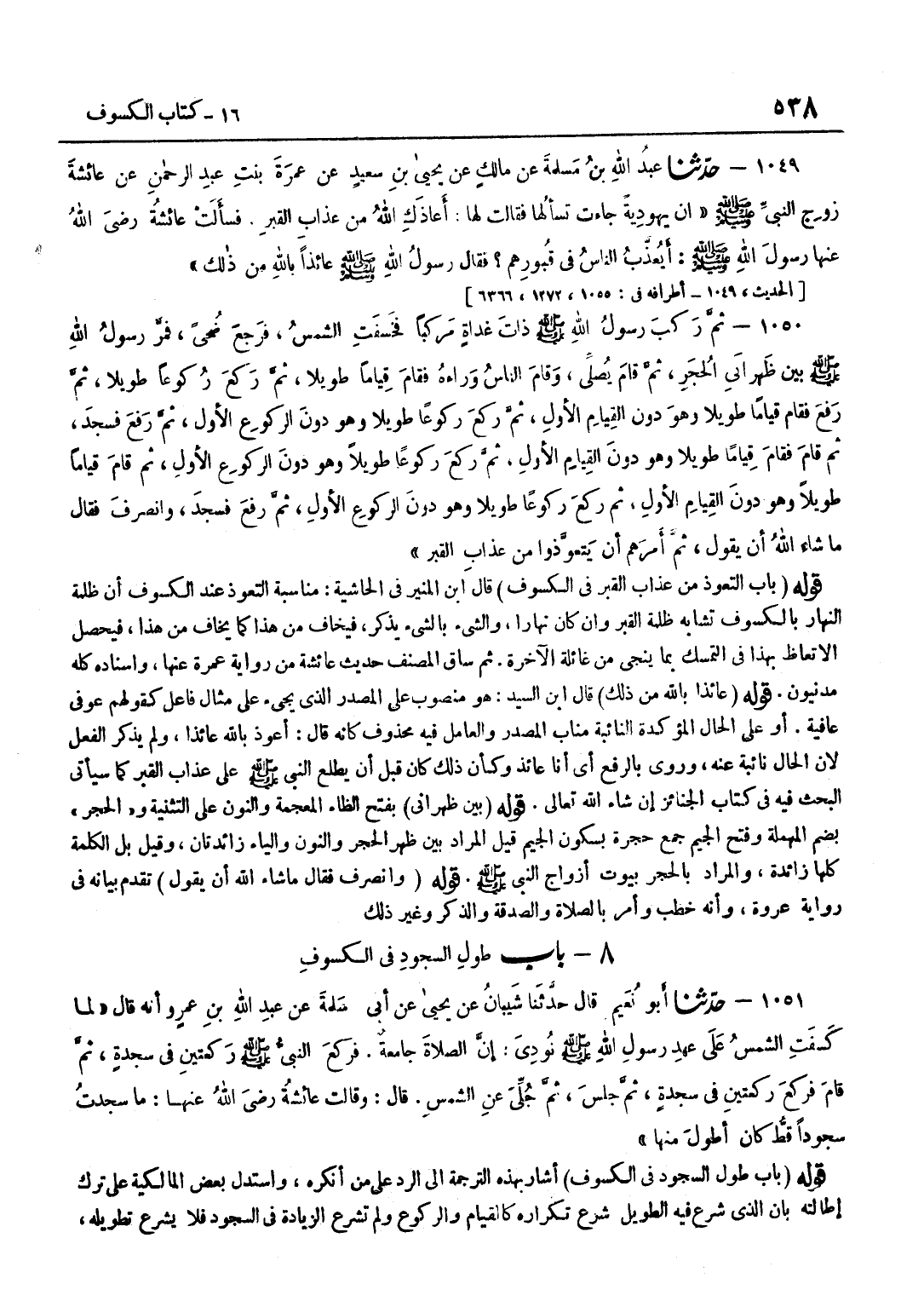 [1049] قَوْله عائذا بِاللَّه من ذَلِك قَالَ بن السَّيِّدِ هُوَ مَنْصُوبٌ عَلَى الْمَصْدَرِ الَّذِي يَجِيءُ عَلَى مِثَالِ فَاعِلٍ كَقَوْلِهِمْ عُوفِيَ عَافِيَةً أَوْ عَلَى الْحَالِ الْمُؤَكِّدَةِ النَّائِبَةِ مَنَابَ الْمَصْدَرِ وَالْعَامِلُ فِيهِ مَحْذُوفٌ كَأَنَّهُ قَالَ أَعُوذُ بِاللَّهِ عَائِذًا وَلَمْ يَذْكُرِ الْفِعْلَ لِأَنَّ الْحَالَ نَائِبَةٌ عَنْهُ وَرُوِيَ بِالرَّفْعِ أَيْ أَنَا عَائِذٌ وَكَأَنَّ ذَلِكَ كَانَ قَبْلَ أَنْ يَطَّلِعَ النَّبِيُّ صَلَّى اللَّهُ عَلَيْهِ وَسَلَّمَ عَلَى عَذَابِ الْقَبْرِ كَمَا سَيَأْتِي الْبَحْثُ فِيهِ فِي كِتَابِ الْجَنَائِزِ إِنْ شَاءَ اللَّهُ تَعَالَى قَوْلُهُ بَيْنَ ظَهْرَانَيْ بِفَتْحِ الظَّاءِ الْمُعْجَمَة وَالنُّون على التَّثْنِيَة وَالْحُجَرُ بِضَمِّ الْمُهْمَلَةِ وَفَتْحِ الْجِيمِ جَمْعُ حُجْرَةٍ بِسُكُونِ الْجِيمِ قِيلَ الْمُرَادُ بَيْنَ ظَهْرِ الْحُجَرِ وَالنُّونُ وَالْيَاءُ زَائِدَتَانِ وَقِيلَ بَلِ الْكَلِمَةُ كُلُّهَا زَائِدَةٌ وَالْمُرَادُ بِالْحُجَرِ بُيُوتُ أَزْوَاجِ النَّبِيِّ صَلَّى اللَّهُ عَلَيْهِ وَسَلَّمَ قَوْلُهُ وَانْصَرَفَ فَقَالَ مَا شَاءَ اللَّهُ أَنْ يَقُولَ تَقَدَّمَ بَيَانُهُ فِي رِوَايَةِ عُرْوَةَ وَأَنَّهُ خَطَبَ وَأَمَرَ بِالصَّلَاةِ وَالصَّدَقَةِ وَالذِّكْرِ وَغير ذَلِك