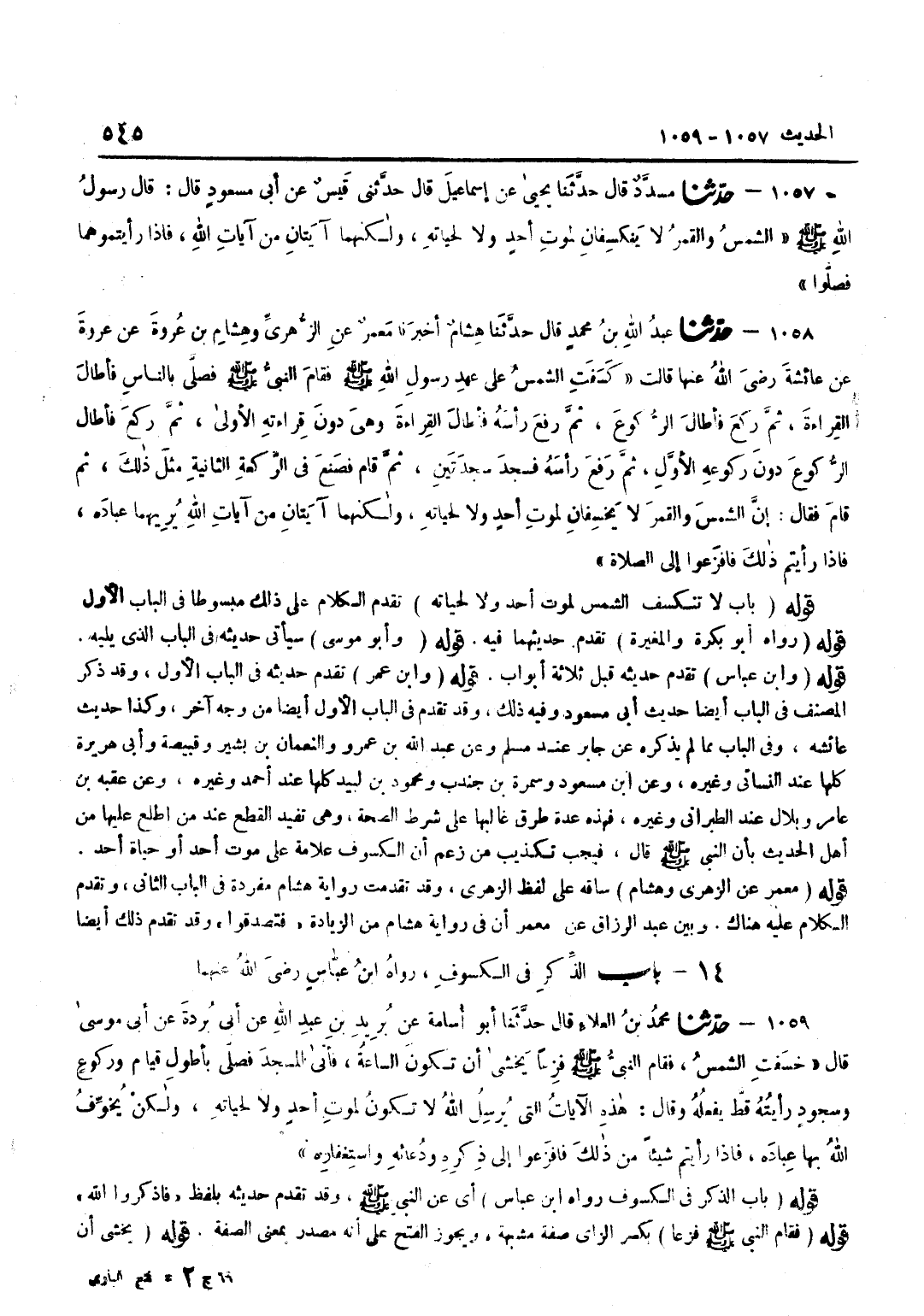 تَقَدَّمَ الْكَلَامُ عَلَى ذَلِكَ مَبْسُوطًا فِي الْبَابِ الْأَوَّلِ قَوْلُهُ رَوَاهُ أَبُو بَكْرَةَ وَالْمُغِيرَةُ تَقَدَّمَ حَدِيثُهُمَا فِيهِ قَوْلُهُ وَأَبُو مُوسَى سَيَأْتِي حَدِيثُهُ فِي الْبَابِ الَّذِي يَلِيهِ قَوْلُهُ وبن عَبَّاسٍ تَقَدَّمَ حَدِيثُهُ قَبْلَ ثَلَاثَةِ أَبْوَابٍ قَوْلُهُ وبن عُمَرَ تَقَدَّمَ حَدِيثُهُ فِي الْبَابِ الْأَوَّلِ وَقَدْ ذَكَرَ الْمُصَنِّفُ فِي الْبَابِ أَيْضًا حَدِيثَ أَبِي مَسْعُودٍ وَفِيهِ ذَلِكَ وَقَدْ تَقَدَّمَ فِي الْبَابِ الْأَوَّلِ أَيْضًا مِنْ وَجْهٍ آخَرَ وَكَذَا حَدِيثَ عَائِشَةَ وَفِي الْبَابِ مِمَّا لَمْ يَذْكُرْهُ عَنْ جَابِرٍ عِنْدَ مُسْلِمٍ وَعَنْ عَبْدِ اللَّهِ بْنِ عَمْرٍو وَالنُّعْمَانِ بْنِ بَشِيرٍ وَقَبِيصَةَ وَأَبِي هُرَيْرَةَ كلهَا عِنْد النَّسَائِيّ وَغَيره وَعَن بن مَسْعُودٍ وَسَمُرَةَ بْنِ جُنْدَبٍ وَمَحْمُودِ بْنِ لَبِيَدٍ كُلُّهَا عِنْدَ أَحْمَدَ وَغَيْرِهِ وَعَنْ عُقْبَةَ بْنِ عَامِرٍ وَبِلَالٍ عِنْدَ الطَّبَرَانِيِّ وَغَيْرِهِ فَهَذِهِ عِدَّةُ طُرُقٍ غَالِبُهَا عَلَى شَرْطِ الصِّحَّةِ وَهِيَ تُفِيدُ الْقَطْعِ عِنْدَ مَنِ اطَّلَعَ عَلَيْهَا مِنْ أَهْلِ الْحَدِيثِ بِأَنَّ النَّبِيَّ صَلَّى اللَّهُ عَلَيْهِ وَسَلَّمَ قَالَ فَيَجِبُ تَكْذِيبُ مَنْ زَعَمَ أَنَّ الْكُسُوفَ عَلَامَةٌ عَلَى مَوْتِ أَحَدٍ أَوْ حَيَاةِ أَحَدٍ