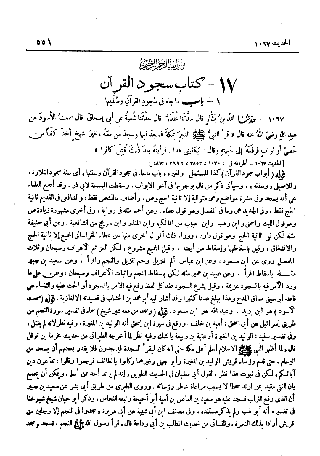 كَذَا لِلْمُسْتَمْلِي وَلِغَيْرِهِ بَابُ مَا جَاءَ فِي سُجُودِ الْقُرْآنِ وَسُنَّتِهَا أَيْ سُنَّةِ سُجُودِ التِّلَاوَةِ وَلِلْأَصِيلِيِّ وَسُنَّتِهِ وَسَيَأْتِي ذِكْرُ مَنْ قَالَ بِوُجُوبِهَا فِي آخِرِ الْأَبْوَابِ وَسَقَطَتِ الْبَسْمَلَةُ لِأَبِي ذَرٍّ وَقَدْ أَجْمَعَ الْعُلَمَاءُ عَلَى أَنَّهُ يَسْجُدُ وَفِي عَشَرَةِ مَوَاضِعَ وَهِيَ مُتَوَالِيَة إِلَّا ثَانِيَة الْحَج وص وَأَضَافَ مَالِكٌ ص فَقَطْ وَالشَّافِعِيُّ فِي الْقَدِيمِ ثَانِيَةُ الْحَجِّ فَقَطْ وَفِي الْجَدِيدِ هِيَ وَمَا فِي الْمُفَصَّلِ وَهُوَ قَوْلُ عَطَاءٍ وَعَنْ أَحْمَدَ مِثْلُهُ فِي رِوَايَةٍ وَفِي أُخْرَى مَشْهُورَةٍ زِيَادَةُ ص وَهُوَ قَول اللَّيْث وَإِسْحَاق وبن وهب وبن حبيب من الْمَالِكِيَّة وبن الْمُنْذر وبن سُرَيْجٍ مِنَ الشَّافِعِيَّةِ وَعَنْ أَبِي حَنِيفَةَ مِثْلُهُ لَكِنْ نَفَى ثَانِيَةَ الْحَجِّ وَهُوَ قَوْلُ دَاوُدَ وَوَرَاءَ ذَلِكَ أَقْوَالٌ أُخْرَى مِنْهَا عَنْ عَطَاءٍ الخرساني الْجَمِيعُ إِلَّا ثَانِيَةَ الْحَجِّ وَالِانْشِقَاقِ وَقِيلَ بِإِسْقَاطِهِمَا وَإِسْقَاطِ ص أَيْضًا وَقِيلَ الْجَمِيعُ مَشْرُوعٌ وَلَكِنِ الْعَزَائِمُ الْأَعْرَافُ وَسُبْحَانَ وَثَلَاثُ الْمُفَصَّلِ رُوِيَ عَنِ بن مَسْعُود وَعَن بن عَبَّاسٍ الم تَنْزِيلُ وحم تَنْزِيلُ وَالنَّجْمِ وَاقْرَأْ وَعَنْ سَعِيدِ بْنِ جُبَيْرٍ مِثْلُهُ بِإِسْقَاطِ اقْرَأْ وَعَنْ عُبَيْدِ بْنِ عُمَيْرٍ مِثْلُهُ لَكِنْ بِإِسْقَاطِ النَّجْمِ وَإِثْبَاتِ الْأَعْرَافِ وَسُبْحَانَ وَعَنْ عَلِيٍّ مَا وَرَدَ الْأَمْرُ فِيهِ بِالسُّجُودِ عَزِيمَةً وَقِيلَ يُشْرَعُ السُّجُودُ عِنْدَ كُلِّ لَفْظٍ وَقَعَ فِيهِ الْأَمْرُ بِالسُّجُودِ أَوْ الْحَثِّ عَلَيْهِ وَالثَّنَاءِ عَلَى فَاعِلِهِ أَوْ سِيقَ مَسَاقَ الْمَدْحِ وَهَذَا يَبْلُغُ عَدَدًا كَثِيرًا وَقَدْ أَشَارَ إِلَيْهِ أَبُو مُحَمَّدِ بْنُ الْخَشَّابِ فِي قَصِيدَتِهِ الْإِلْغَازِيَّةِ قَوْلُهُ سَمِعْتُ الْأَسْوَدَ هُوَ بن يزِيد وَعبد الله هُوَ بن مَسْعُودٍ