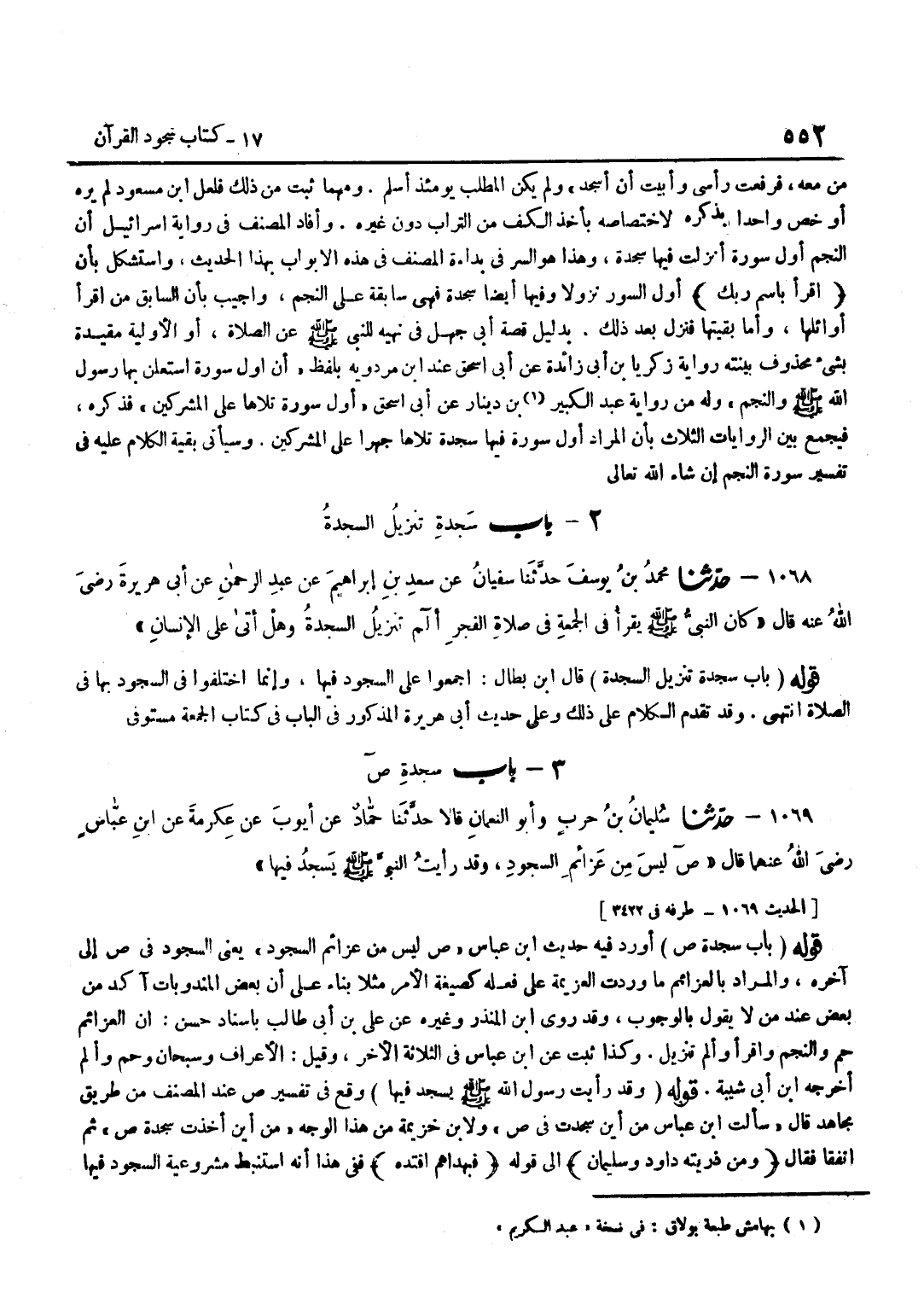 قَالَ بن بَطَّالٍ أَجْمَعُوا عَلَى السُّجُودِ فِيهَا وَإِنَّمَا اخْتَلَفُوا فِي السُّجُودِ بِهَا فِي الصَّلَاةِ انْتَهَى وَقَدْ تَقَدَّمَ الْكَلَامُ عَلَى ذَلِكَ وَعَلَى حَدِيثِ أَبِي هُرَيْرَةَ الْمَذْكُورِ فِي الْبَابِ فِي كِتَابِ الْجُمُعَةِ مُسْتَوفى قَوْلُهُ بَابُ سَجْدَةِ ص أَوْرَدَ فِيهِ حَدِيثَ بن عَبَّاسٍ ص لَيْسَ مِنْ عَزَائِمِ السُّجُودِ يَعْنِي السُّجُودَ فِي ص إِلَى آخِرِهِ وَالْمُرَادُ بِالْعَزَائِمِ مَا وَرَدَتِ الْعَزِيمَةُ عَلَى فِعْلِهِ كَصِيغَةِ الْأَمْرِ مَثَلًا بِنَاءً عَلَى أَنَّ بَعْضَ الْمَنْدُوبَاتِ آكَدُ مِنْ بَعْضٍ عِنْدَ مَنْ لَا يَقُولُ بِالْوُجُوبِ وَقد روى بن الْمُنْذِرِ وَغَيْرُهُ عَنْ عَلِيِّ بْنِ أَبِي طَالِبٍ بِإِسْنَادٍ حَسَنٍ أَنَّ الْعَزَائِمَ حم وَالنَّجْمِ وَاقْرَأْ وألم تَنْزِيل وَكَذَا ثَبت عَن بن عَبَّاسٍ فِي الثَّلَاثَةِ الْأُخَرِ وَقِيلَ الْأَعْرَافُ وَسُبْحَانَ وحم وألم أخرجه بن أَبِي شَيْبَةَ قَوْلُهُ وَقَدْ رَأَيْتُ رَسُولَ اللَّهِ صَلَّى اللَّهُ عَلَيْهِ وَسَلَّمَ يَسْجُدُ فِيهَا وَقَعَ فِي تَفْسِيرِ ص عِنْدَ الْمُصَنِّفِ مِنْ طَرِيقِ مُجَاهِد قَالَ سَأَلت بن عَبَّاسٍ مِنْ أَيْنَ سَجَدْتَ فِي ص وَلِابْنِ خُزَيْمَةَ مِنْ هَذَا الْوَجْهِ مِنْ أَيْنَ أَخَذْتَ سَجْدَةَ ص ثُمَّ اتَّفَقَا فَقَالَ وَمِنْ ذُرِّيَّتِهِ دَاوُد وَسليمَان إِلَى قَوْله فبهداهم اقتده فَفِي هَذَا أَنَّهُ اسْتَنْبَطَ مَشْرُوعِيَّةَ السُّجُودِ فِيهَا
