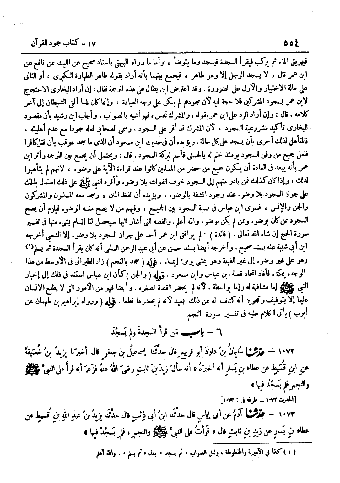 فَيُهْرِيقُ الْمَاءَ ثُمَّ يَرْكَبُ فَيَقْرَأُ السَّجْدَةَ فَيَسْجُدُ وَمَا يَتَوَضَّأُ وَأَمَّا مَا رَوَاهُ الْبَيْهَقِيُّ بِإِسْنَادٍ صَحِيح عَن اللَّيْث عَن نَافِع عَن بن عُمَرَ قَالَ لَا يَسْجُدُ الرَّجُلُ إِلَّا وَهُوَ طَاهِرٌ فَيُجْمَعُ بَيْنَهُمَا بِأَنَّهُ أَرَادَ بِقَوْلِهِ طَاهِرٌ الطَّهَارَةَ الْكُبْرَى أَوِ الثَّانِي عَلَى حَالَةِ الِاخْتِيَارِ وَالْأول على الضَّرُورَة وَقد اعْترض بن بَطَّالٍ عَلَى هَذِهِ التَّرْجَمَةِ فَقَالَ إِنْ أَرَادَ الْبُخَارِيُّ الِاحْتِجَاجَ لِابْنِ عُمَرَ بِسُجُودِ الْمُشْرِكِينَ فَلَا حُجَّةَ فِيهِ لِأَنَّ سُجُودَهُمْ لَمْ يَكُنْ عَلَى وَجْهِ الْعِبَادَةِ وَإِنَّمَا كَانَ لَمَّا أَلْقَى الشَّيْطَانُ إِلَى آخِرِ كَلَامِهِ قَالَ وَإِنْ أَرَادَ الرَّدَّ على بن عُمَرَ بِقَوْلِهِ وَالْمُشْرِكُ نَجَسٌ فَهُوَ أَشْبَهُ بِالصَّوَابِ وَأجَاب بن رَشِيدٍ بِأَنَّ مَقْصُودَ الْبُخَارِيِّ تَأْكِيدُ مَشْرُوعِيَّةِ السُّجُودِ لِأَنَّ الْمُشْرِكَ قَدْ أَقَرَّ عَلَى السُّجُودِ وَسَمَّى الصَّحَابِيُّ فِعْلَهُ سُجُودًا مَعَ عَدَمِ أَهْلِيَّتِهِ فَالْمُتَأَهِّلُ لِذَلِكَ أَحْرَى بِأَنْ يَسْجُدَ عَلَى كُلِّ حَالَةٍ وَيُؤَيِّدهُ أَن فِي حَدِيث بن مَسْعُودٍ أَنَّ الَّذِي مَا سَجَدَ عُوقِبَ بِأَنْ قَتَلَ كَافِرًا فَلَعَلَّ جَمِيعَ مَنْ وُفِّقَ لِلسُّجُودِ يَوْمَئِذٍ خُتِمَ لَهُ بِالْحُسْنَى فَأَسْلَمَ لِبَرَكَةِ السُّجُودِ قَالَ وَيُحْتَمَلُ أَنْ يُجْمَعَ بَيْنَ التَّرْجَمَةِ وَأَثَرِ بن عُمَرَ بِأَنَّهُ يَبْعُدُ فِي الْعَادَةِ أَنْ يَكُونَ جَمِيعُ مَنْ حَضَرَ مِنَ الْمُسْلِمِينَ كَانُوا عِنْدَ قِرَاءَةِ الْآيَةِ عَلَى وُضُوءٍ لِأَنَّهُمْ لَمْ يَتَأَهَّبُوا لِذَلِكَ وَإِذَا كَانَ كَذَلِكَ فَمَنْ بَادَرَ مِنْهُمْ إِلَى السُّجُودِ خَوْفَ الْفَوَاتِ بِلَا وُضُوءٍ وَأَقَرَّهُ النَّبِيُّ صَلَّى اللَّهُ عَلَيْهِ وَسَلَّمَ عَلَى ذَلِكَ اسْتُدِلَّ بِذَلِكَ عَلَى جَوَازِ السُّجُودِ بِلَا وُضُوءٍ عِنْدَ وُجُودِ الْمَشَقَّةِ بِالْوُضُوءِ وَيُؤَيِّدُهُ أَنَّ لَفْظَ الْمَتْنِ وَسَجَدَ مَعَهُ الْمُسْلِمُونَ وَالْمُشْرِكُونَ وَالْجِنُّ وَالْإِنْسُ فسوى بن عَبَّاسٍ فِي نِسْبَةِ السُّجُودِ بَيْنَ الْجَمِيعِ وَفِيهِمْ مَنْ لَا يَصِحُّ مِنْهُ الْوُضُوءُ فَيَلْزَمُ أَنْ يَصِحَّ السُّجُودُ مِمَّنْ كَانَ بِوُضُوءٍ وَمِمَّنْ لَمْ يَكُنْ بِوُضُوءٍ وَاللَّهُ أَعْلَمُ وَالْقِصَّةُ الَّتِي أَشَارَ إِلَيْهَا سَيَحْصُلُ لَنَا إِلْمَامٌ بِشَيْءٍ مِنْهَا فِي تَفْسِيرِ سُورَةِ الْحَجِّ إِنْ شَاءَ اللَّهُ تَعَالَى فَائِدَة لم يُوَافق بن عُمَرَ أَحَدٌ عَلَى جَوَازِ السُّجُودِ بِلَا وُضُوءٍ إِلَّا الشّعبِيّ أخرجه بن أَبِي شَيْبَةَ عَنْهُ بِسَنَدٍ صَحِيحٍ وَأَخْرَجَهُ أَيْضًا بِسَنَدٍ حَسَنٍ عَنْ أَبِي عَبْدِ الرَّحْمَنِ السُّلَمِيِّ أَنَّهُ كَانَ يقْرَأ السَّجْدَة ثمَّ يسلم وَهُوَ عَلَى غَيْرِ وُضُوءٍ إِلَى غَيْرِ الْقِبْلَةِ وَهُوَ يَمْشِي يُومِئُ إِيمَاءً