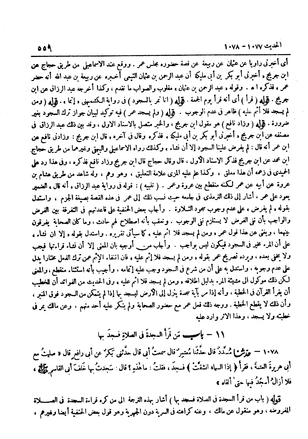 أَيْ أَخْبَرَنِي رَاوِيًا عَنْ عُثْمَانَ عَنْ رَبِيعَةَ عَنْ قِصَّةِ حُضُورِهِ مَجْلِسَ عُمَرَ وَوَقَعَ عِنْدَ الْإِسْمَاعِيلِيّ من طَرِيق حجاج عَن بن جُرَيْجٍ أَخْبَرَنِي أَبُو بَكْرِ بْنُ أَبِي مُلَيْكَةَ أَنَّ عَبْدَ الرَّحْمَنِ بْنَ عُثْمَانَ التَّيْمِيَّ أَخْبَرَهُ عَنْ رَبِيعَةَ بْنِ عَبْدِ اللَّهِ أَنَّهُ حَضَرَ عُمَرَ فَذَكَرَهُ اه وَقَوْلُهُ عَبْدُ الرَّحْمَنِ بْنُ عُثْمَانَ مَقْلُوبٌ وَالصَّوَابُ مَا تَقَدَّمَ وَكَذَا أَخْرَجَهُ عبد الرَّزَّاق عَن بن جُرَيْجٍ قَوْلُهُ قَرَأَ أَيْ أَنَّهُ قَرَأَ يَوْمَ الْجُمُعَةِ قَوْلُهُ إِنَّا نَمُرُّ بِالسُّجُودِ فِي رِوَايَةِ الْكُشْمِيهَنِيِّ إِنَّمَا قَوْلُهُ وَمَنْ لَمْ يَسْجُدْ فَلَا إِثْمَ عَلَيْهِ ظَاهِرٌ فِي عَدَمِ الْوُجُوبِ قَوْلُهُ وَلَمْ يَسْجُدْ عُمَرُ فِيهِ تَوْكِيدٌ لِبَيَانِ جَوَازِ تَرْكِ السُّجُودِ بِغَيْرِ ضَرُورَةٍ قَوْلُهُ وَزَادَ نَافِعٌ هُوَ مقول بن جُرَيْجٍ وَالْخَبَرُ مُتَّصِلٌ بِالْإِسْنَادِ الْأَوَّلِ وَقَدْ بَيَّنَ ذَلِك عبد الرَّزَّاق فِي مُصَنفه عَن بن جُرَيْجٍ أَخْبَرَنِي أَبُو بَكْرِ بْنُ أَبِي مُلَيْكَةَ فَذكره وَقَالَ فِي آخِره قَالَ بن جريج وَزَادَنِي نَافِع عَن بن عُمَرَ أَنَّهُ قَالَ لَمْ يُفْرَضْ عَلَيْنَا السُّجُودُ إِلَّا أَنْ نَشَاءَ وَكَذَلِكَ رَوَاهُ الْإِسْمَاعِيلِيُّ وَالْبَيْهَقِيُّ وَغَيْرُهُمَا مِنْ طَرِيقِ حَجَّاجِ بْنِ مُحَمَّدٍ عَنِ بن جُرَيْجٍ فَذَكَرَ الْإِسْنَادَ الْأَوَّلَ قَالَ وَقَالَ حَجَّاجٌ قَالَ بن جُرَيْجٍ وَزَادَ نَافِعٌ فَذَكَرَهُ وَفِي هَذَا رَدٌّ عَلَى الْحُمَيْدِيِّ فِي زَعْمِهِ أَنَّ هَذَا مُعَلَّقٌ وَكَذَا عَلَّمَ عَلَيْهِ الْمِزِّيُّ عَلَامَةَ التَّعْلِيقِ وَهُوَ وَهَمٌ وَلَهُ شَاهِدٌ مِنْ طَرِيقِ هِشَامِ بْنِ عُرْوَةَ عَنْ أَبِيهِ عَنْ عُمَرَ لَكِنَّهُ مُنْقَطِعٌ بَيْنَ عُرْوَةَ وَعُمَرَ تَنْبِيهٌ قَوْلُهُ فِي رِوَايَةِ عَبْدِ الرَّزَّاقِ أَنَّهُ قَالَ الضَّمِيرُ يَعُودُ عَلَى عُمَرَ أَشَارَ إِلَى ذَلِكَ التِّرْمِذِيُّ فِي جَامِعِهِ حَيْثُ نَسَبَ ذَلِكَ إِلَى عُمَرَ فِي هَذِهِ الْقِصَّةِ بِصِيغَةِ الْجَزْمِ وَاسْتَدَلَّ بِقَوْلِهِ لَمْ يُفْرَضْ عَلَى عَدَمِ وُجُوبِ سُجُودِ التِّلَاوَةِ وَأَجَابَ بَعْضُ الْحَنَفِيَّةِ عَلَى قَاعِدَتِهِمْ فِي التَّفْرِقَةِ بَيْنَ الْفَرْضِ وَالْوَاجِبِ بِأَنَّ نَفْيَ الْفَرْضِ لَا يَسْتَلْزِمُ نَفْيَ الْوُجُوبِ وَتُعُقِّبَ بِأَنَّهُ اصْطِلَاحٌ لَهُمْ حَادِثٌ وَمَا كَانَ الصَّحَابَةُ يُفَرِّقُونَ بَيْنَهُمَا وَيُغْنِي عَنْ هَذَا قَوْلُ عُمَرَ وَمَنْ لَمْ يَسْجُدْ فَلَا إِثْمَ عَلَيْهِ كَمَا سَيَأْتِي تَقْرِيرُهُ وَاسْتُدِلَّ بِقَوْلِهِ إِلَّا أَنْ نَشَاءَ عَلَى أَنَّ الْمَرْءَ مُخَيَّرٌ فِي السُّجُودِ فَيَكُونُ لَيْسَ بِوَاجِبٍ وَأَجَابَ مَنْ أَوْجَبَهُ بِأَنَّ الْمَعْنَى إِلَّا أَنْ نَشَاءَ قِرَاءَتَهَا فَيَجِبُ وَلَا يَخْفَى بُعْدُهُ وَيَرُدُّهُ تَصْرِيحُ عُمَرَ بِقَوْلِهِ وَمَنْ لَمْ يَسْجُدْ فَلَا إِثْمَ عَلَيْهِ فَإِنَّ انْتِفَاءَ الْإِثْمِ عَمَّنْ تَرَكَ الْفِعْلَ مُخْتَارًا يَدُلُّ على عدم وُجُوبه وَاسْتدلَّ بِهِ على أَن من شرع فِي السُّجُود وَجب عَلَيْهِ إِتْمَامُهُ وَأُجِيبَ بِأَنَّهُ اسْتِثْنَاءٌ مُنْقَطِعٌ وَالْمَعْنَى لَكِنَّ ذَلِكَ مَوْكُولٌ إِلَى مَشِيئَةِ الْمَرْءِ بِدَلِيلِ إِطْلَاقِهِ وَمَنْ لَمْ يَسْجُدْ فَلَا إِثْمَ عَلَيْهِ وَفِي الْحَدِيثِ مِنَ الْفَوَائِدِ أَنَّ لِلْخَطِيبِ أَنْ يَقْرَأَ الْقُرْآنَ فِي الْخُطْبَةِ وَأَنَّهُ إِذَا مَرَّ بِآيَةِ سَجْدَةٍ يَنْزِلُ إِلَى الْأَرْضِ لِيَسْجُدَ بِهَا إِذَا لَمْ يَتَمَكَّنْ مِنَ السُّجُودِ فَوْقَ الْمِنْبَرِ وَأَنَّ ذَلِكَ لَا ي