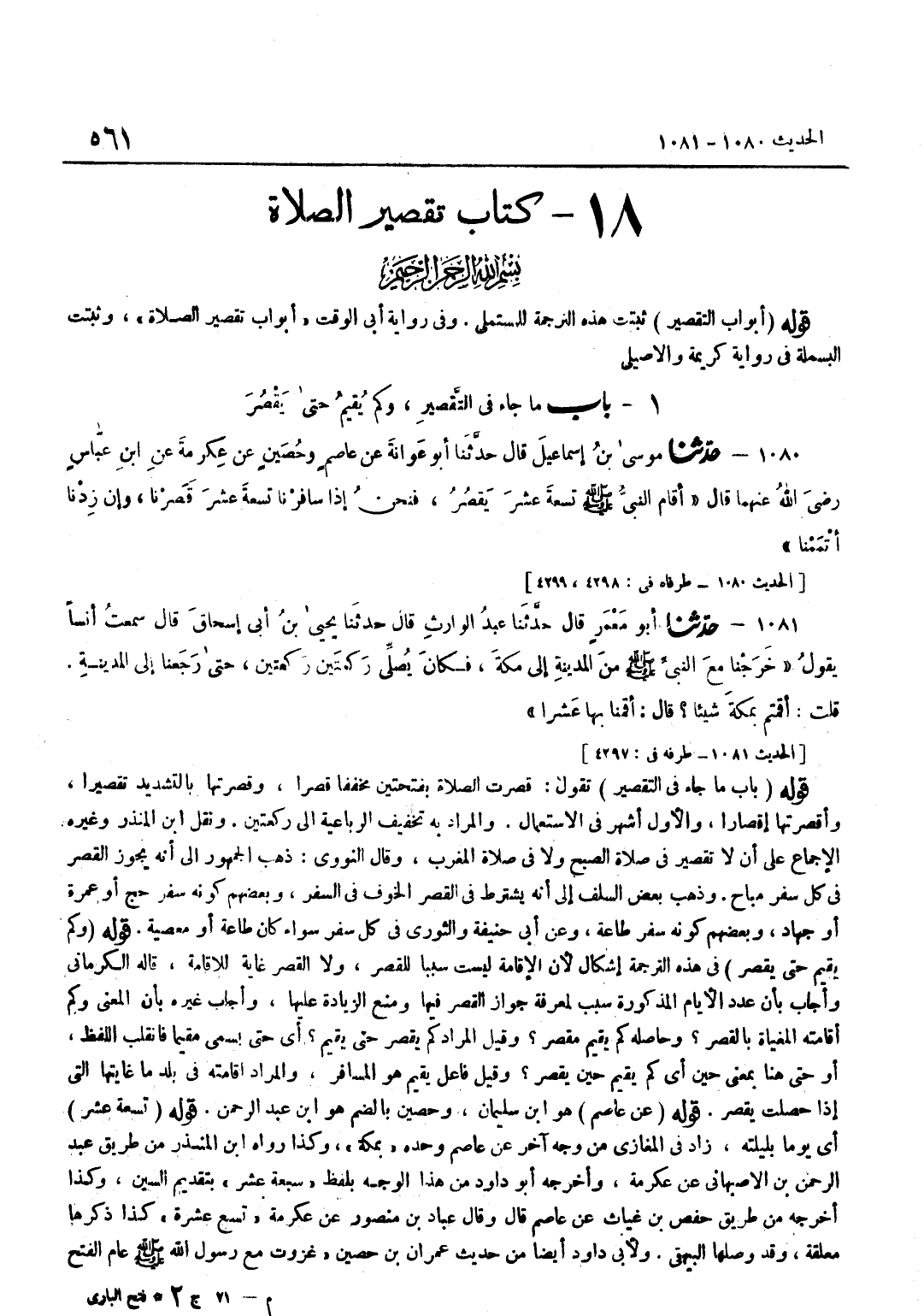 [1080] قَوْلُهُ عَنْ عَاصِمٍ هُوَ بن سُلَيْمَان وحصين بِالضَّمِّ هُوَ بن عَبْدِ الرَّحْمَنِ قَوْلُهُ تِسْعَةَ عَشَرَ أَيْ يَوْمًا بِلَيْلَتِهِ زَادَ فِي الْمَغَازِي مِنْ وَجْهٍ آخَرَ عَن عَاصِم وَحده بِمَكَّة وَكَذَا رَوَاهُ بن الْمُنْذِرِ مِنْ طَرِيقِ عَبْدِ الرَّحْمَنِ بْنِ الْأَصْبَهَانِيِّ عَنْ عِكْرِمَةَ وَأَخْرَجَهُ أَبُو دَاوُدَ مِنْ هَذَا الْوَجْهِ بِلَفْظِ سَبْعَةَ عَشَرَ بِتَقْدِيمِ السِّينِ وَكَذَا أَخْرَجَهُ مِنْ طَرِيقِ حَفْصِ بْنِ غِيَاثٍ عَنْ عَاصِمٍ قَالَ وَقَالَ عَبَّادُ بْنُ مَنْصُورٍ عَنْ عِكْرِمَةَ تِسْعَ عَشْرَةَ كَذَا ذَكَرَهَا مُعَلَّقَةً وَقَدْ وَصَلَهَا الْبَيْهَقِيُّ وَلِأَبِي دَاوُدَ أَيْضًا مِنْ حَدِيثِ عِمْرَانَ بْنِ حُصَيْنٍ غَزَوْتُ مَعَ رَسُولِ اللَّهِ صَلَّى اللَّهُ عَلَيْهِ وَسَلَّمَ عَامَ الْفَتْحِ