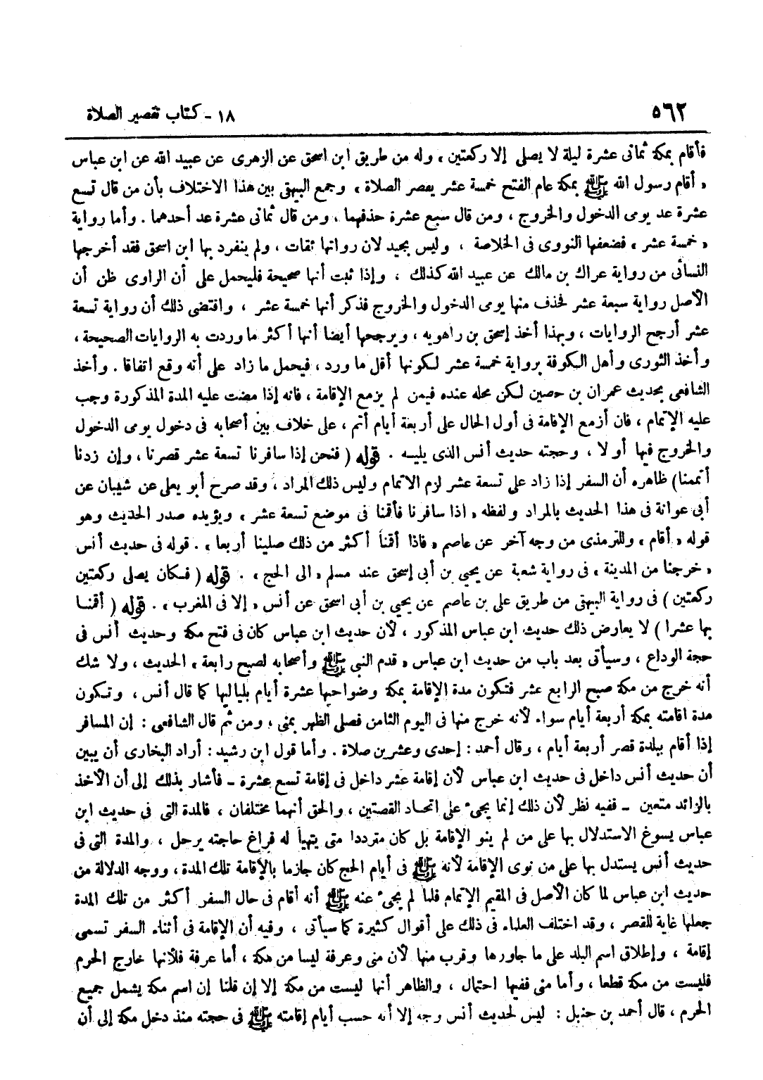 فَأَقَامَ بِمَكَّةَ ثَمَانِيَ عَشْرَةَ لَيْلَةً لَا يُصَلِّي إِلَّا رَكْعَتَيْنِ وَله من طَرِيق بن إِسْحَاقَ عَنِ الزُّهْرِيِّ عَنْ عُبَيْدِ اللَّهِ عَنِ بن عَبَّاسٍ أَقَامَ رَسُولُ اللَّهِ صَلَّى اللَّهُ عَلَيْهِ وَسَلَّمَ بِمَكَّةَ عَامَ الْفَتْحِ خَمْسَةَ عَشَرَ يَقْصُرُ الصَّلَاةَ وَجَمَعَ الْبَيْهَقِيُّ بَيْنَ هَذَا الِاخْتِلَافِ بِأَنَّ مَنْ قَالَ تِسْعَ عَشْرَةَ عَدَّ يَوْمَيِ الدُّخُولِ وَالْخُرُوجِ وَمَنْ قَالَ سَبْعَ عَشْرَةَ حَذَفَهُمَا وَمَنْ قَالَ ثَمَانِيَ عَشْرَةَ عَدَّ أَحَدَهُمَا وَأَمَّا رِوَايَةُ خَمْسَةَ عَشَرَ فَضَعَّفَهَا النَّوَوِيُّ فِي الْخُلَاصَةِ وَلَيْسَ بِجَيِّدٍ لِأَنَّ رُوَاتَهَا ثِقَاتٌ وَلَمْ يَنْفَرِدْ بِهَا بن إِسْحَاقَ فَقَدْ أَخْرَجَهَا النَّسَائِيُّ مِنْ رِوَايَةِ عِرَاكِ بْنِ مَالِكٍ عَنْ عُبَيْدِ اللَّهِ كَذَلِكَ وَإِذَا ثَبَتَ أَنَّهَا صَحِيحَةٌ فَلْيُحْمَلْ عَلَى أَنَّ الرَّاوِيَ ظَنَّ أَنَّ الْأَصْلَ رِوَايَةُ سَبْعَةَ عَشَرَ فَحَذَفَ مِنْهَا يَوْمَيِ الدُّخُولِ وَالْخُرُوجِ فَذَكَرَ أَنَّهَا خَمْسَةَ عَشَرَ وَاقْتَضَى ذَلِكَ أَنَّ رِوَايَةَ تِسْعَةَ عَشَرَ أَرْجَحُ الرِّوَايَاتِ وَبِهَذَا أَخَذَ إِسْحَاقُ بْنُ رَاهْوَيْهِ وَيُرَجِّحُهَا أَيْضًا أَنَّهَا أَكْثَرُ مَا وَرَدَتْ بِهِ الرِّوَايَاتُ الصَّحِيحَةُ وَأَخَذَ الثَّوْرِيُّ وَأَهْلُ الْكُوفَةِ بِرِوَايَةِ خَمْسَةَ عَشَرَ لِكَوْنِهَا أَقَلَّ مَا وَرَدَ فَيُحْمَلُ مَا زَادَ عَلَى أَنَّهُ وَقَعَ اتِّفَاقًا وَأَخَذَ الشَّافِعِيُّ بِحَدِيثِ عِمْرَانَ بْنِ حُصَيْنٍ لَكِنْ مَحَلُّهُ عِنْدَهُ فِيمَنْ لَمْ يُزْمِعِ الْإِقَامَةَ فَإِنَّهُ إِذَا مَضَتْ عَلَيْهِ الْمُدَّةُ الْمَذْكُورَةُ وَجَبَ عَلَيْهِ الْإِتْمَامُ فَإِنْ أَزْمَعَ الْإِقَامَةَ فِي أَوَّلِ الْحَالِ عَلَى أَرْبَعَةِ أَيَّامٍ أَتَمَّ عَلَى خِلَافٍ بَيْنَ أَصْحَابِهِ فِي دُخُول يومى الدُّخُول وَالْخُرُوج فِيهَا أَولا وَحُجَّتُهُ حَدِيثُ أَنَسٍ الَّذِي يَلِيهِ قَوْلُهُ فَنَحْنُ إِذا سافرنا تِسْعَة عَشَرَ قَصَرْنَا وَإِنْ زِدْنَا أَتْمَمْنَا ظَاهِرُهُ أَنَّ السَّفَرَ إِذَا زَادَ عَلَى تِسْعَةَ عَشَرَ لَزِمَ الْإِتْمَامُ وَلَيْسَ ذَلِكَ الْمُرَادَ وَقَدْ صَرَّحَ أَبُو يَعْلَى عَنْ شَيْبَانَ عَنْ أَبِي عَوَانَةَ فِي هَذَا الْحَدِيثِ بِالْمُرَادِ وَلَفْظِهِ إِذَا سَافَرْنَا فَأَقَمْنَا فِي مَوْضِعٍ تِسْعَةَ عَشَرَ وَيُؤَيِّدُهُ صَدْرُ الْحَدِيثِ وَهُوَ قَوْلُهُ أَقَامَ وَلِلتِّرْمِذِيِّ مِنْ وَجْهٍ آخَرَ عَنْ عَاصِمٍ فَإِذَا أَقَمْنَا أَكْثَرَ مِنْ ذَلِكَ صَلَّيْنَا أَرْبَعًا