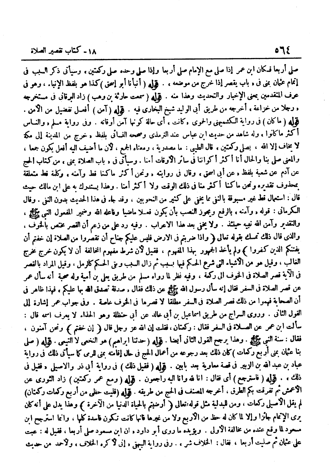 [1083] قَوْلُهُ سَمِعْتُ حَارِثَةَ بْنَ وَهْبٍ زَادَ الْبَرْقَانِيُّ فِي مُسْتَخْرَجِهِ رَجُلًا مِنْ خُزَاعَةَ أَخْرَجَهُ مِنْ طَرِيقِ أَبِي الْوَلِيدِ شَيْخِ الْبُخَارِيِّ فِيهِ قَوْلُهُ آمَنَ أَفْعَلُ تَفْضِيلٍ مِنَ الْأَمْنِ قَوْلُهُ مَا كَانَ فِي رِوَايَةِ الْكُشْمِيهَنِيِّ وَالْحَمَوِيِّ كَانَتْ أَيْ حَالَةَ كَوْنِهَا آمَنَ أَوْقَاتِهِ وَفِي رِوَايَةِ مُسْلِمٍ وَالنَّاسُ أَكْثَرُ مَا كَانُوا وَلَهُ شَاهِدٌ مِنْ حَدِيث بن عَبَّاسٍ عِنْدَ التِّرْمِذِيِّ وَصَحَّحَهُ النَّسَائِيُّ بِلَفْظِ خَرَجَ مِنَ الْمَدِينَةِ إِلَى مَكَّةَ لَا يَخَافُ إِلَّا اللَّهَ يُصَلِّي رَكْعَتَيْنِ قَالَ الطِّيبِيُّ مَا مَصْدَرِيَّةٌ وَمَعْنَاهُ الْجَمْعُ لِأَنَّ مَا أُضِيفَ إِلَيْهِ أَفْعَلُ يَكُونُ جَمْعًا وَالْمَعْنَى صَلَّى بِنَا وَالْحَالُ أَنَّا أَكْثَرُ أَكْوَانِنَا فِي سَائِرِ الْأَوْقَاتِ أَمْنًا وَسَيَأْتِي فِي بَابِ الصَّلَاةِ بِمِنًى مِنْ كِتَابِ الْحَجِّ عَنْ آدَمَ عَنْ شُعْبَةَ بِلَفْظِ عَنْ أَبِي إِسْحَاقَ وَقَالَ فِي رِوَايَتِهِ وَنَحْنُ أَكْثَرُ مَا كُنَّا قَطُّ وَآمَنُهُ وَكَلِمَةُ قَطُّ مُتَعَلِّقَةٌ بِمَحْذُوفٍ تَقْدِيرُهُ وَنَحْنُ مَا كُنَّا أَكْثَرَ مِنَّا فِي ذَلِكَ الْوَقْتِ وَلَا أَكْثَرَ أَمْنًا وَهَذَا يَسْتَدْرِكُ بِهِ عَلِيُّ بْنُ مَالِكٍ حَيْثُ قَالَ اسْتِعْمَالُ قَطُّ غَيْرُ مَسْبُوقَةٍ بِالنَّفْيِ مِمَّا يَخْفَى عَلَى كَثِيرٍ مِنَ النَّحْوِيِّينَ وَقَدْ جَاءَ فِي هَذَا الْحَدِيثِ بِدُونِ النَّفْيِ وَقَالَ الْكِرْمَانِيُّ قَوْلُهُ وَآمَنُهُ بِالرَّفْعِ وَيَجُوزُ النَّصْبُ بِأَنْ يَكُونَ فِعْلًا مَاضِيًا وَفَاعِلُهُ اللَّهُ وَضَمِيرُ الْمَفْعُولِ النَّبِيُّ صَلَّى اللَّهُ عَلَيْهِ وَسَلَّمَ وَالتَّقْدِيرُ وَآمَنَ اللَّهُ نَبِيَّهُ حِينَئِذٍ وَلَا يَخْفَى بُعْدُ هَذَا الْإِعْرَابِ وَفِيهِ رَدٌّ عَلَى مَنْ زَعَمَ أَنَّ الْقَصْرَ مُخْتَصٌّ بِالْخَوْفِ وَالَّذِي قَالَ ذَلِكَ تَمَسَّكَ بِقولِهِ تَعَالَى وَإِذَا ضَرَبْتُمْ فِي الْأَرْضِ فَلَيْسَ عَلَيْكُمْ جُنَاحٌ أَنْ تَقْصُرُوا مِنَ الصَّلَاةِ إِنْ خِفْتُمْ أَنْ يَفْتِنَكُمُ الَّذين كفرُوا وَلَمْ يَأْخُذِ الْجُمْهُورُ بِهَذَا الْمَفْهُومِ فَقِيلَ لِأَنَّ شَرْطَ مَفْهُومِ الْمُخَالَفَةِ أَنْ لَا يَكُونَ خَرَجَ مَخْرَجَ الْغَالِبِ وَقِيلَ هُوَ مِنَ الْأَشْيَاءِ الَّتِي شُرِعَ الْحُكْمُ فِيهَا بِسَبَبٍ ثُمَّ زَالَ السَّبَبُ وَبَقِيَ الْحُكْمُ كَالرَّمْلِ وَقِيلَ الْمُرَادُ بِالْقَصْرِ فِي الْآيَةِ قَصْرُ الصَّلَاةِ فِي الْخَوْفِ إِلَى رَكْعَةٍ وَفِيهِ نَظَرٌ لِمَا رَوَاهُ مُسْلِمٌ مِنْ طَرِيقِ يَعْلَى بْنِ أُمَيَّةَ وَلَهُ صُحْبَةٌ أَنَّهُ سَأَلَ عُمَرَ عَنْ قَصْرِ الصَّلَاةِ فِي السَّفَرِ فَقَالَ أَنَّهُ سَأَلَ رَسُولَ اللَّهِ صَلَّى اللَّهُ عَلَيْهِ وَسَلَّمَ عَنْ ذَلِكَ فَقَالَ صَدَقَةٌ تَصَدَّقَ اللَّهُ بِهَا عَلَيْكُمْ فَهَذَا ظَاهِرٌ فِي أَنَّ الصَّحَابَةَ فَهِمُوا مِنْ ذَلِكَ قَصْرَ الصَّلَاةِ فِي السَّفَرِ مُطْلَقًا لَا قَصْرَهَا فِي الْخَوْفِ خَاصَّةً وَفِي جَوَابِ عُمَرَ إِشَارَةٌ إِلَى الْقَوْلِ الثَّانِي وَرَوَى السَّرَّاجُ مِنْ طَرِيقِ إِسْمَاعِيلَ بْنِ أَبِي خَالِدٍ عَنْ أَبِي حَنْظَلَةَ وَهُوَ الْحَذَّاءُ لَا يُعْرَفُ اسْمه قَالَ سَأَلت بن عُمَرَ عَنِ الصَّلَاةِ فِي السَّفَرِ فَقَالَ رَكْعَتَانِ فَقُلْتُ إِنَّ اللَّهَ عَزَّ وَجَلَّ قَالَ إِنْ خِفْتُمْ وَنَحْنُ آمِنُونَ فَقَالَ سُنَّةُ النَّبِيِّ صَلَّى اللَّهُ عَلَيْهِ وَسَلَّمَ وَهَذَا يُرَجِّحُ الْقَوْلَ الثَّانِيَ أَيْضًا