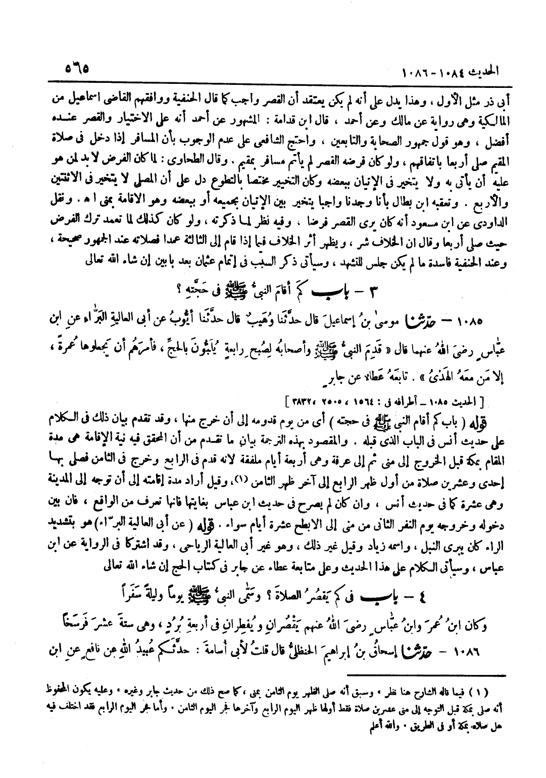 أَبِي ذَرٍّ مِثْلُ الْأَوَّلِ وَهَذَا يَدُلُّ عَلَى أَنَّهُ لَمْ يَكُنْ يَعْتَقِدُ أَنَّ الْقَصْرَ وَاجِبٌ كَمَا قَالَ الْحَنَفِيَّةُ وَوَافَقَهُمُ الْقَاضِي إِسْمَاعِيلُ مِنَ الْمَالِكِيَّةِ وَهِيَ رِوَايَةٌ عَنْ مَالِكٍ وَعَنْ أَحْمَدَ قَالَ بن قُدَامَةَ الْمَشْهُورُ عَنْ أَحْمَدَ أَنَّهُ عَلَى الِاخْتِيَارِ وَالْقَصْرُ عِنْدَهُ أَفْضَلُ وَهُوَ قَوْلُ جُمْهُورِ الصَّحَابَةِ وَالتَّابِعِينَ وَاحْتَجَّ الشَّافِعِيُّ عَلَى عَدَمِ الْوُجُوبِ بِأَنَّ الْمُسَافِرَ إِذَا دَخَلَ فِي صَلَاةِ الْمُقِيمِ صَلَّى أَرْبَعًا بِاتِّفَاقِهِمْ وَلَوْ كَانَ فَرْضُهُ الْقَصْرَ لَمْ يَأْتَمَّ مُسَافِرٌ بِمُقِيمٍ وَقَالَ الطَّحَاوِيُّ لَمَّا كَانَ الْفَرْضُ لَا بُدَّ لِمَنْ هُوَ عَلَيْهِ أَنْ يَأْتِيَ بِهِ وَلَا يَتَخَيَّرُ فِي الْإِتْيَانِ بِبَعْضِهِ وَكَانَ التَّخْيِيرُ مُخْتَصًّا بِالتَّطَوُّعِ دَلَّ عَلَى أَنَّ الْمُصَلِّيَ لَا يَتَخَيَّرُ فِي الِاثْنَتَيْنِ وَالْأَرْبَعِ وَتَعَقَّبَهُ بن بَطَّالٍ بِأَنَّا وَجَدْنَا وَاجِبًا يَتَخَيَّرُ بَيْنَ الْإِتْيَانِ بِجَمِيعِهِ أَوْ بِبَعْضِهِ وَهُوَ الْإِقَامَةُ بِمِنًى اه وَنقل الدَّاودِيّ عَن بن مَسْعُودٍ أَنَّهُ كَانَ يَرَى الْقَصْرَ فَرْضًا وَفِيهِ نَظَرٌ لِمَا ذَكَرْتُهُ وَلَوْ كَانَ كَذَلِكَ لَمَا تَعَمَّدَ تَرْكَ الْفَرْضِ حَيْثُ صَلَّى أَرْبَعًا وَقَالَ إِنَّ الْخِلَافَ شَرٌّ وَيَظْهَرُ أَثَرُ الْخِلَافِ فِيمَا إِذَا قَامَ إِلَى الثَّالِثَةِ عَمْدًا فَصَلَاتُهُ عِنْدَ الْجُمْهُورِ صَحِيحَةٌ وَعِنْدَ الْحَنَفِيَّةِ فَاسِدَةٌ مَا لَمْ يَكُنْ جَلَسَ لِلتَّشَهُّدِ وَسَيَأْتِي ذِكْرُ السَّبَبِ فِي إِتْمَامِ عُثْمَانَ بَعْدَ بَابَيْنِ إِنْ شَاءَ اللَّهُ تَعَالَى