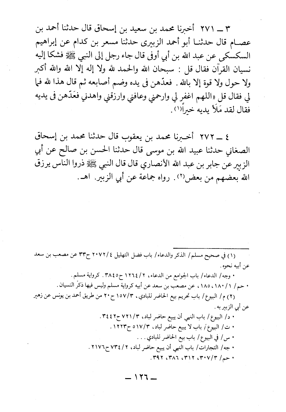 ٢٧١ - أَخْبَرَنَا مُحَمَّدُ بْنُ سَعِيدِ بْنِ إِسْحَاقَ، قَالَ: حَدثنا أَحمَدُ بْنُ عِصَامٍ، قَالَ: حَدثنا أَبُو أَحمَد الزُّبَيْرِيُّ، حَدثنا مِسْعَرُ بْنُ كِدَامٍ، عَنْ إِبْرَاهِيمَ السَّكْسَكِيِّ، عَنْ عَبْدِ الله بْنِ أَبِي أَوَفَى قَالَ: جَاءَ رَجُلٌ إِلَى النَّبِيِّ صَلَّى الله عَلَيْهِ وَسَلَّمْ فَشَكَا إِلَيْهِ نِسْيَانَ القُرْآنَ فَقَالَ: قُلْ: سُبْحَانَ الله وَالحَمْدُ لِلَّهِ وَلَا إِلَهَ إِلَاّ الله وَالله أَكْبَرُ وَلَا حَوْلَ وَلَا قُوَّةَ إِلَاّ بِالله فَعَدَّهُنَّ فِي يَدِهِ وَضَمَّ أَصَابِعَهُ ثُمَّ قَالَ: هَذَا لِلَّهِ فَمَا لِي؟ فَقَالَ: قُلِ اللهمَّ اغْفِرْ لِي وَارْحَمْنِي وَعَافِنِي وَارْزُقْنِي وَاهْدِنِي فَعَدَّهُنَّ فِي يَدَيْهِ فَقَالَ: لقَدْ مَلأ يَدَيْهِ خَيْرًا.