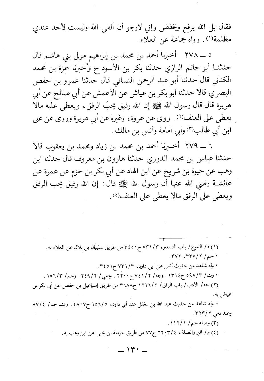 ٢٧٨ - أَخْبَرَنَا أَحمَدُ بْنُ مُحَمَّدِ بْنِ إِبْرَاهِيمَ، مَوْلَى بَنِي هَاشِمٍ، قَالَ: حَدثنا أَبُو حَاتِمٍ الرَّازِيُّ، حَدثنا بَكْرُ بْنُ الأَسْوَدِ (ح) وَأَخْبَرَنَا حَمْزَةُ بْنُ مُحَمَّدٍ الكِنَانِيُّ، قَالَ: حَدثنا أَبُو عَبْدِ الرَّحْمَنِ النَّسَائِيُّ، قَالَ: حَدثنا عَمْرُو بْنُ حَفْصٍ البَصْرِيُّ، قَالَا: حَدثنا أَبُو بَكْرِ بْنُ عَيَّاشٍ، عَنِ الأَعْمَشِ، عَنْ أَبِي صَالِحٍ، عَنْ أَبِي هُرَيْرَةَ قَالَ: قَالَ رَسُولُ الله صَلى الله عَليه وسَلم: إِنَّ الله رَفِيقٌ يُحِبُّ الرِّفْقَ، وَيُعْطِي عَلَيْهِ مَا لَا يُعْطِي عَلَى العُنْفِ.