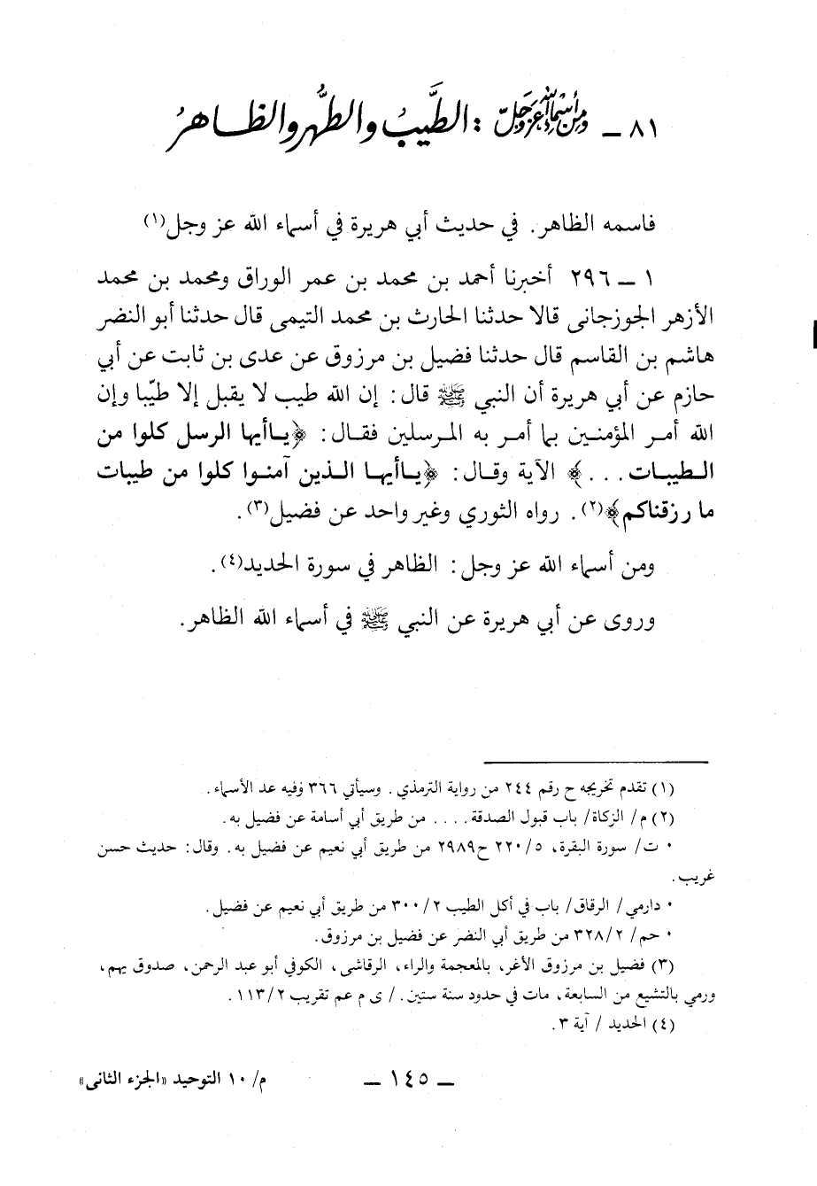 ٨١ - وَمِنْ أَسْمَاءِ الله عَزَّ وَجَلَّ: الطَّيِّبُ وَالطُّهْرُ وَالظَّاهِرُ.
