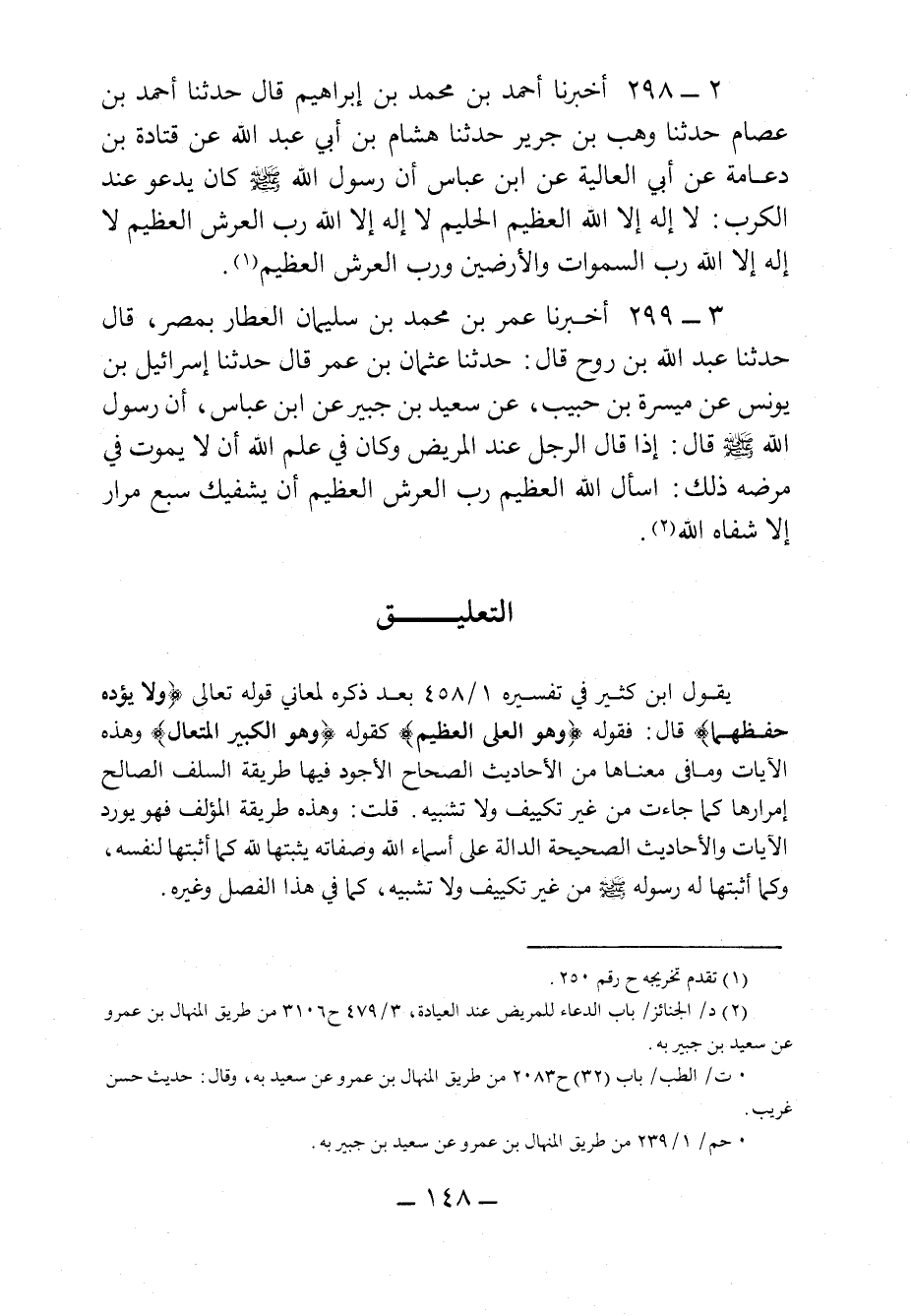 ٢٩٨ - أَخْبَرَنَا أَحمَدُ بْنُ مُحَمَّدِ بْنِ إِبْرَاهِيمَ، قَالَ: حَدثنا أَحمَدُ بْنُ عِصَامٍ، حَدثنا وَهْبُ بْنُ جَرِيرٍ، حَدثنا هِشَامُ بْنُ أَبِي عَبْدِ الله، عَنْ قَتَادَةَ بْنِ دِعَامَةَ، عَنْ أَبِي العَالِيَةِ، عَنِ ابْنِ عَبَّاسٍ، أَنَّ رَسُولَ الله صَلى الله عَليه وسَلم كَانَ يَدْعُو عِنْدَ الكَرْبِ: لَا إِلَهَ إِلَاّ الله العَظِيمُ الحَلِيمُ، لَا إِلَهَ إِلَاّ الله رَبُّ العَرْشِ العَظِيمُ، لَا إِلَهَ إِلَاّ الله رَبُّ السَّمَاوَاتِ وَالأَرَضِينَ، وَرَبُّ العَرْشِ العَظِيمُ.