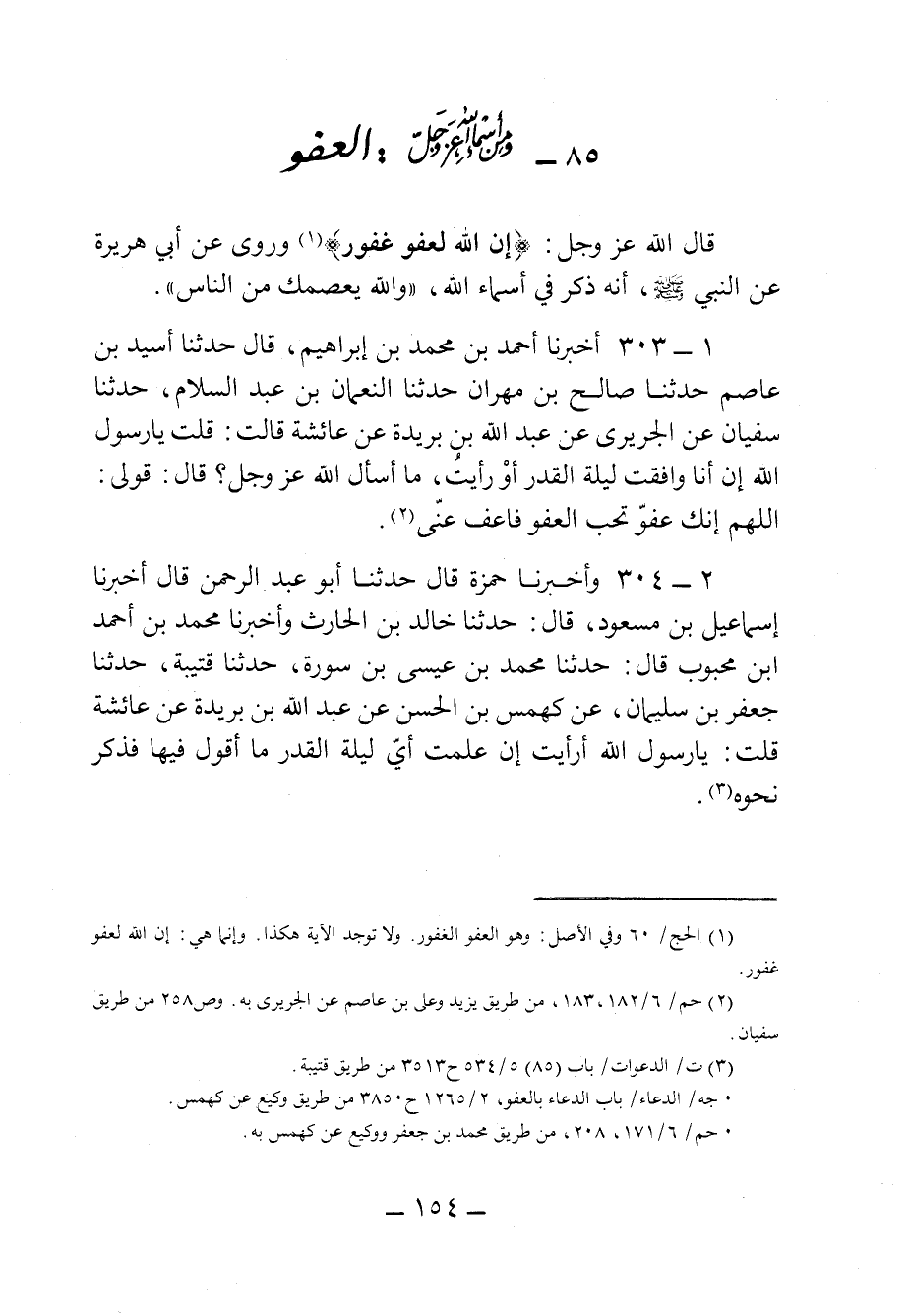 ٣٠٣ - أَخْبَرَنَا أَحمَدُ بْنُ مُحَمَّدِ بْنِ إِبْرَاهِيمَ، قَالَ: حَدثنا أُسَيْدُ بْنُ عَاصِمٍ، حَدثنا صَالِحُ بْنُ مِهْرَانَ، حَدثنا النُّعْمَانُ بْنُ عَبْدِ السَّلَامِ، حَدثنا سُفْيَانُ، عَنِ الجُرَيْرِيِّ، عَنْ عَبْدِ الله بْنِ بُرَيْدَةَ، عَنْ عَائِشَةَ قَالَتْ: قُلْتُ: يَا رَسُولَ الله، إِنْ أَنَا وَافَقْتُ ليْلَةَ القَدْرِ أَوْ رَأَيْتُ، مَا أَسْأَلُ الله عَزَّ وَجَلَّ؟ قَالَ: قُولِي: اللهمَّ إِنَّكَ عَفُوٌّ تُحِبُّ العَفْوَ فَاعْفُ عَنِّي.