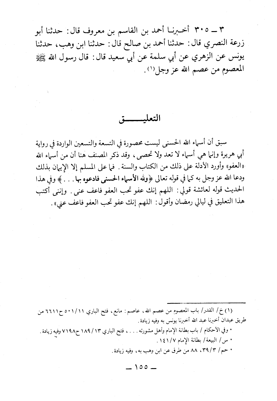 ٣٠٥ - أَخْبَرَنَا أَحمَدُ بْنُ القَاسِمِ بْنِ مَعْرُوفٍ، قَالَ: حَدثنا أَبُو زُرْعَةَ النَّصْرِيُّ، قَالَ: حَدثنا أَحمَدُ بْنُ صَالِحٍ، قَالَ: حَدثنا ابْنُ وَهْبٍ، حَدثنا يُونُسُ، عَنِ الزُّهْرِيِّ، عَنْ أَبِي سَلَمَةَ، عَنْ أَبِي سَعِيدٍ قَالَ: قَالَ رَسُولُ الله صَلى الله عَليه وسَلم: المَعْصُومُ مَنْ عَصَمَ الله عَزَّ وَجَلَّ.