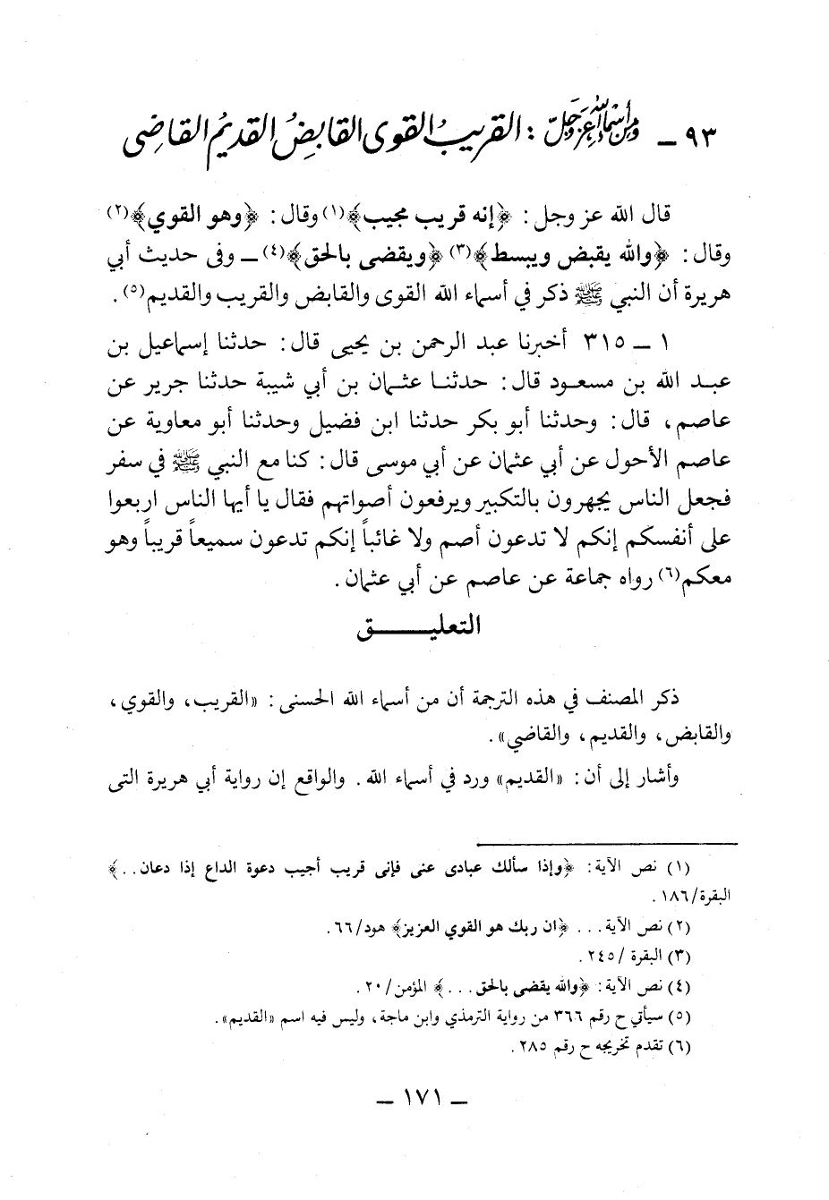 ٩٣ - وَمِنْ أَسْمَاءِ الله عَزَّ وَجَلَّ: القَرِيبُ وَالقَوِيُّ القَابِضُ وَالقَدِيمُ القَاضِي.
