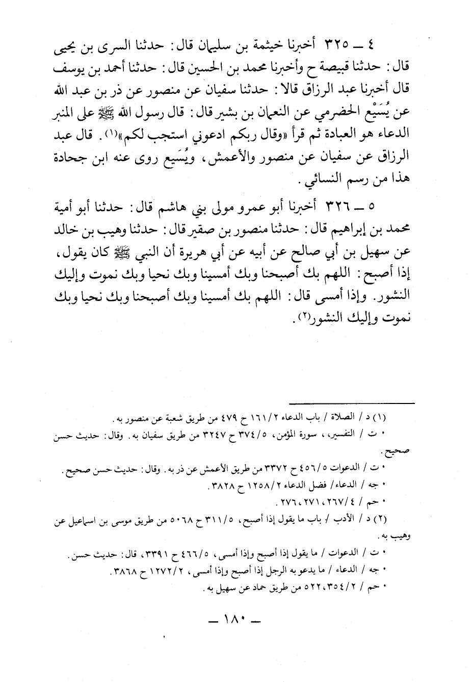 ٣٢٥ - أَخْبَرَنَا خَيْثَمَةُ بْنُ سُلَيْمَانَ، قَالَ: حَدثنا السَّرِيُّ بْنُ يَحْيَى، قَالَ: حَدثنا قَبِيصَةُ (ح) وَأَخْبَرَنَا مُحَمَّدُ بْنُ الحُسَيْنِ، قَالَ: حَدثنا أَحمَدُ بْنُ يُوسُفَ، قَالَ: أَخْبَرَنَا عَبْدُ الرَّزَّاقِ، قَالَا: حَدثنا سُفْيَانُ، عَنْ مَنْصُورٍ، عَنْ ذَرِّ بْنِ عَبْدِ الله، عَنْ يُسَيْعٍ الحَضْرَمِيِّ، عَنِ النُّعْمَانِ بْنِ بَشِيرٍ، قَالَ: قَالَ رَسُولُ الله صَلى الله عَليه وسَلم عَلَى المِنْبَرِ: الدُّعَاءُ هُوَ العِبَادَةُ ثُمَّ قَرَأَ {وَقَالَ رَبُّكُمُ ادْعُونِي أَسْتَجِبْ لكُمْ}.