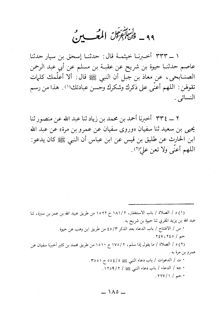 ٣٣٣ - أَخْبَرَنَا خَيْثَمَةُ، قَالَ: حَدثنا إِسْحَاقُ بْنُ سَيَّارٍ، حَدثنا عَاصِمٌ، حَدثنا حَيْوَةُ بْنُ شُرَيْحٍ، عَنْ عُقْبَةَ بْنِ مُسْلِمٍ، عَنْ أَبِي عَبْدِ الرَّحْمَنِ الصُّنَابِحِيِّ، عَنْ مُعَاذِ بْنِ جَبَلٍ، أَنَّ النَّبِيَّ صَلى الله عَليه وسَلم قَالَ: أَلَا أُعَلِّمُكُ كَلِمَاتٍ تَقُولُهُنَّ: اللهمَّ أَعِنِّي عَلَى ذِكْرِكَ وَشُكْرِكَ وَحُسْنِ عِبَادَتِكَ.