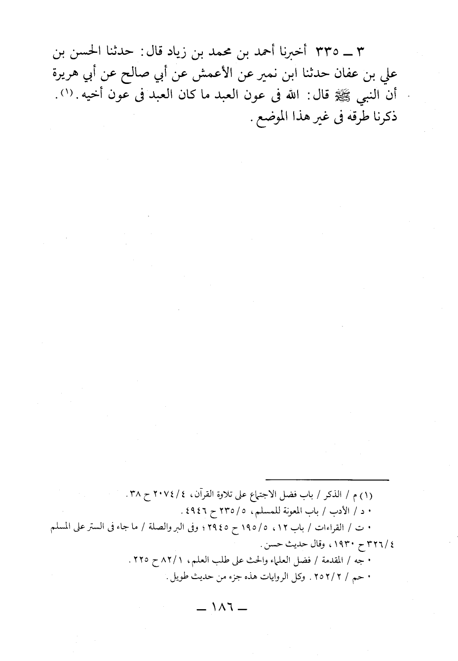٣٣٥ - أَخْبَرَنَا أَحمَدُ بْنُ مُحَمَّدِ بْنِ زِيَادٍ، قَالَ: حَدثنا الحَسَنُ بْنُ عَلِيِّ بْنِ عَفَّانَ، حَدثنا ابْنُ نُمَيْرٍ، عَنِ الأَعْمَشِ، عَنْ أَبِي صَالِحٍ، عَنْ أَبِي هُرَيْرَةَ، أَنَّ النَّبِيَّ صَلى الله عَليه وسَلم قَالَ: الله فِي عَوْنِ العَبْدِ مَا كَانَ العَبْدُ فِي عَوْنِ أَخِيهِ ذَكَرْنَا طُرُقَهُ فِي غَيْرِ هَذَا المَوْضِعِ.