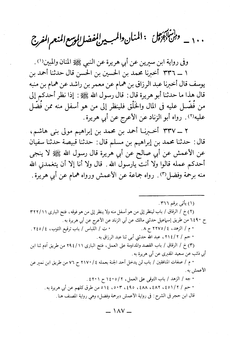٣٣٦ - أَخْبَرَنَا مُحَمَّدُ بْنُ الحُسَيْنِ بْنِ الحَسَنِ، قَالَ: حَدثنا أَحمَدُ بْنُ يُوسُفَ، قَالَ: أَخْبَرَنَا عَبْدُ الرَّزَّاقِ بْنُ هَمَّامٍ، عَنْ مَعْمَرِ بْنِ رَاشِدٍ، عَنْ هَمَّامِ بْنِ مُنَبِّهٍ، قَالَ: هَذَا مَا حَدثنا أَبُو هُرَيْرَةَ قَالَ: قَالَ رَسُولُ الله صَلى الله عَليه وسَلم: إِذَا نَظَرَ أَحَدُكُمْ إِلَى مَنْ فُضِّلَ عَلَيْهِ فِي المَالِ وَالخَلْقِ، فَلْيَنْظُرْ إِلَى مَنْ هُوَ أَسْفَلُ مِنْهُ مِمَّنْ فُضِّلَ عَلَيْهِ.