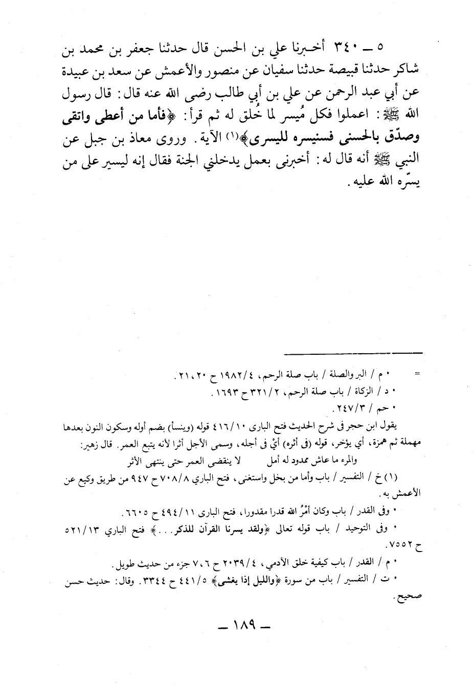 ٣٤٠ - أَخْبَرَنَا عَلِيُّ بْنُ الحَسَنِ، قَالَ: حَدثنا جَعْفَرُ بْنُ مُحَمَّدِ بْنِ شَاكِرٍ، حَدثنا قَبِيصَةُ، حَدثنا سُفْيَانُ، عَنْ مَنْصُورٍ وَالأَعْمَشِ، عَنْ سَعْدِ بْنِ عُبَيْدَةَ، عَنْ أَبِي عَبْدِ الرَّحْمَنِ، عَنْ عَلِيِّ بْنِ أَبِي طَالِبٍ، رَضِيَ الله عَنْهُ، قَالَ: قَالَ رَسُولُ الله صَلى الله عَليه وسَلم: اعْمَلُوا فَكُلٌّ مُيَسَّرٌ لِمَا خُلِقَ لهُ ثُمَّ قَرَأَ: {فَأَمَّا مَنْ أَعْطَى وَاتَّقَى وَصَدَّقَ بِالحُسْنَى فَسَنُيَسِّرُهُ لِلْيُسْرَى} الآيَةَ.