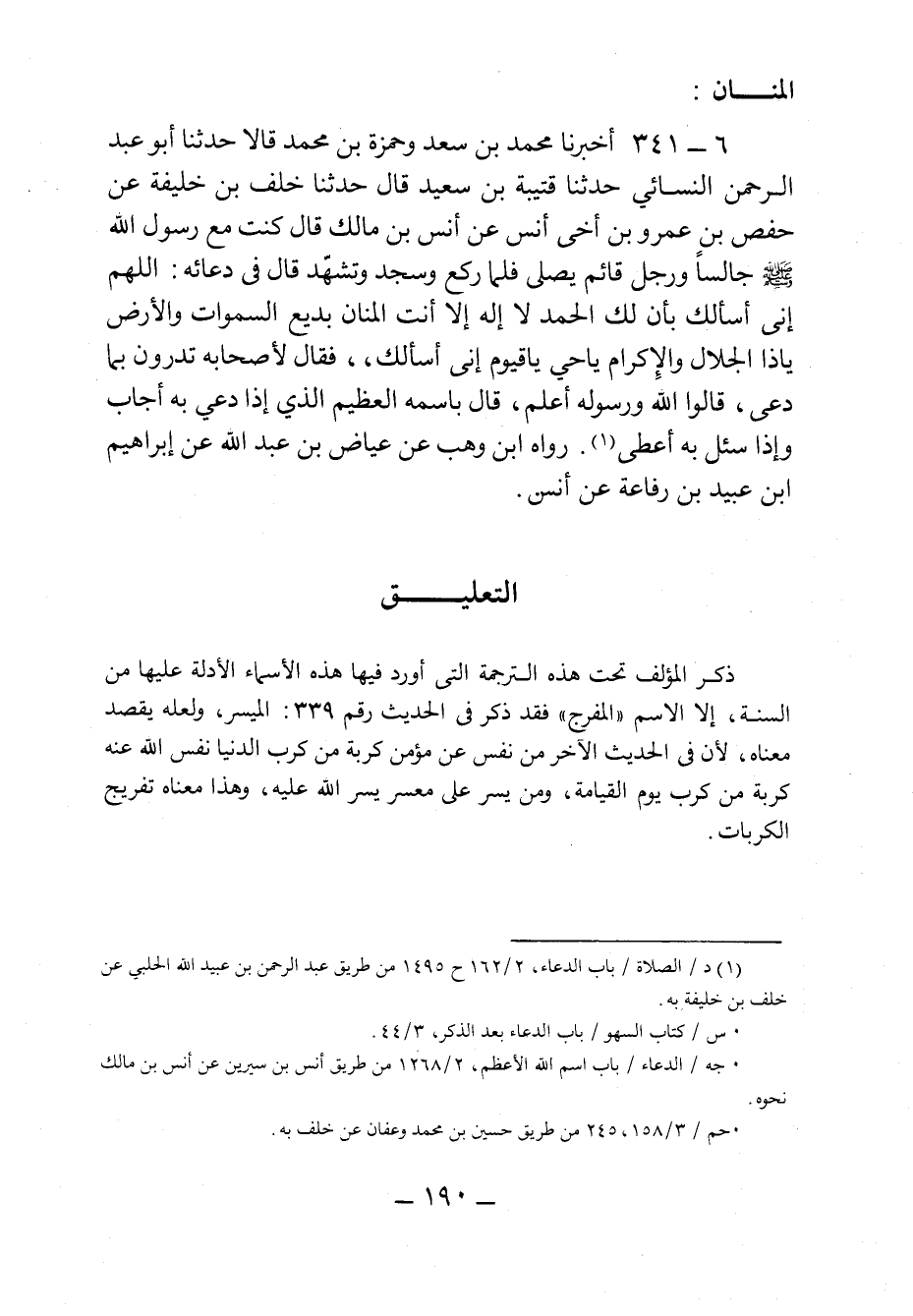 ٣٤١ - أَخْبَرَنَا مُحَمَّدُ بْنُ سَعْدٍ، وَحَمْزَةُ بْنُ مُحَمَّدٍ، قَالَا: حَدثنا أَبُو عَبْدِ الرَّحْمَنِ النَّسَائِيُّ، حَدثنا قُتَيْبَةُ بْنُ سَعِيدٍ، قَالَ: حَدثنا خَلَفُ بْنُ خَلِيفَةَ، عَنْ حَفْصِ بْنِ عَمْرِو ابْنِ أَخِي أَنَسٍ، عَنْ أَنَسِ بْنِ مَالِكٍ قَالَ: كُنْتُ مَعَ رَسُولِ الله صَلى الله عَليه وسَلم جَالِسًا وَرَجُلٌ قَائِمٌ يُصَلِّي، فَلَمَّا رَكَعَ وَسَجَدَ وَتَشَهَّدَ قَالَ فِي دُعَائِهِ: اللهمَّ إِنِّي أَسْأَلُكَ بِأَنَّ لكَ الحَمْدَ لَا إِلَهَ إِلَاّ أَنْتَ المَنَّانُ بَدِيعُ السَّماَوَاتِ وَالأَرْضِ يَا ذَا الجَلَالِ وَالإِكْرَامِ يَا حَيُّ يَا قَيُّومُ إِنِّي أَسْأَلُكَ، فَقَالَ لأصْحَابِهِ: تَدْرُونَ بِمَا دَعَى؟ قَالُوا: الله وَرَسُولُهُ أَعْلَمُ، قَالَ: بِاسْمِهِ العَظِيمِ الَّذِي إِذَا دُعِيَ بِهِ أَجَابَ وَإِذْ سُئِلَ بِهِ أَعْطَى.