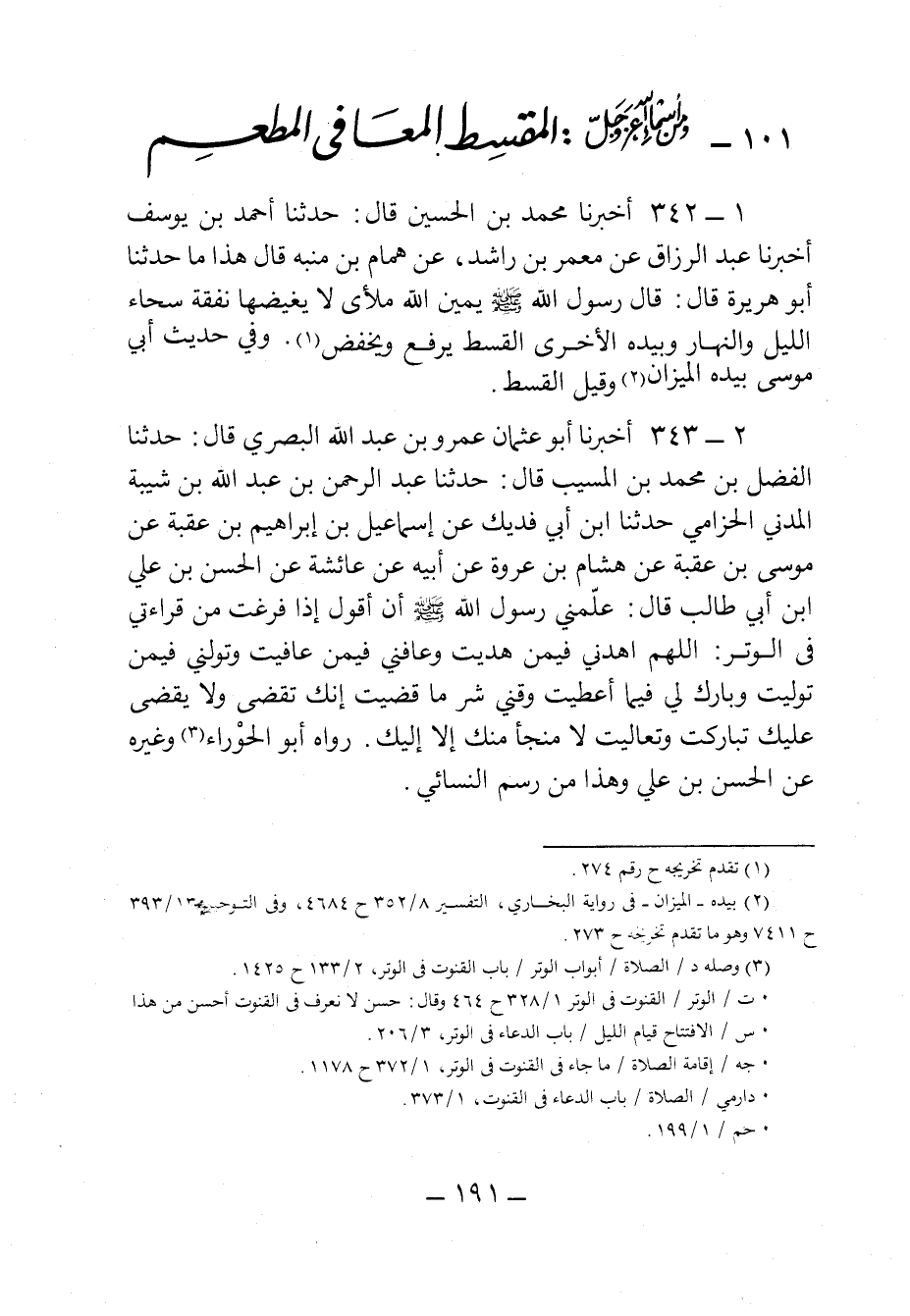 ٣٤٣ - أَخْبَرَنَا أَبُو عُثْمَانَ عَمْرُو بْنُ عَبْدِ الله البَصْرِيُّ، قَالَ: حَدثنا الفَضْلُ بْنُ مُحَمَّدِ بْنِ المُسَيِّبِ قَالَ: حَدَّثَنا عَبْدُ الرَّحْمَنِ بْنُ عَبْدِ الله بْنِ شَيْبَةَ المَدَنِيُّ الحِزَامِيُّ، حَدثنا ابْنُ أَبِي فُدَيْكٍ، عَنْ إِسْمَاعِيلَ بْنِ إِبْرَاهِيمَ بْنِ عُقْبَةَ، عَنْ مُوسَى بْنِ عُقْبَةَ، عَنْ هِشَامِ بْنِ عُرْوَةَ، عَنْ أَبِيهِ، عَنْ عَائِشَةَ، عَنِ الحَسَنِ بْنِ عَلِيِّ بْنِ أَبِي طَالِبٍ قَالَ: عَلَّمَنِي رَسُولُ الله صَلى الله عَليه وسَلم أَنْ أَقُولَ إِذَا فَرَغْتُ مِنْ قِرَاءَتِي فِي الوِتْرِ: اللهمَّ اهْدِنِي فِيمَنْ هَدَيْتُ، وَعَافِنِي فِيمَنْ عَافَيْتُ، وَتَوَلَّنِي فِيمَنْ تَوَلَّيْتَ، وَبَارِكْ لِي فِيمَا أَعْطَيْتَ، وَقِنِي شَرَّ مَا قَضَيْتَ إِنَّكَ تَقْضِي وَلَا يُقْضَى عَلَيْكَ، تَبَارَكْتَ وَتَعَالَيْتَ، لَا مَنْجَا مِنْكَ إِلَاّ إِلَيْكَ.