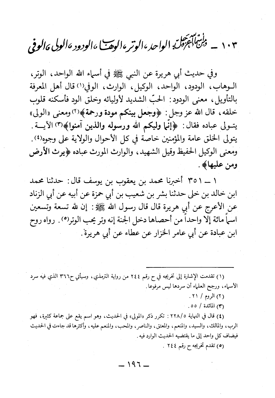 وَفِي حَدِيثِ أَبِي هُرَيْرَةَ، عَنِ النَّبِيِّ صَلَّى الله عَلَيْهِ وَسَلَّمْ فِي أَسْمَاءِ الله الوَاحِدِ، الوِتْرِ، الوَهَّابِ، الوَدُودِ، الوَاحِدِ، الوَكِيلِ، الوَارِثِ، الوَفِيِّ