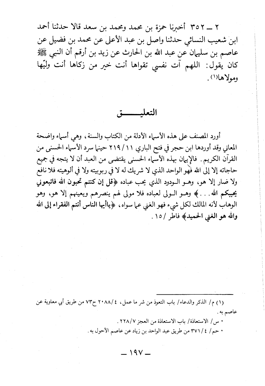 ٣٥٢ - أَخْبَرَنَا حَمْزَةُ بْنُ مُحَمَّدٍ، وَمُحَمَّدُ بْنُ سَعْدٍ قَالَا: حَدثنا أَحمَدُ بْنُ شُعَيْبٍ النَّسَائِيُّ، حَدثنا وَاصِلُ بْنُ عَبْدِ الأَعْلَى، عَنْ مُحَمَّدِ بْنِ فُضَيْلٍ، عَنْ عَاصِمِ بْنِ سُلَيْمَانَ، عَنْ عَبْدِ الله بْنِ الحَارِثِ، عَنْ زَيْدِ بْنِ أَرْقَمَ، أَنَّ النَّبِيَّ صَلى الله عَليه وسَلم كَانَ يَقُولُ: اللهمَّ آتِ نَفْسِي تَقْوَاهَا أَنْتَ خَيْرُ مَنْ زَكَّاهَا أَنْتَ وَلِيُّهَا وَمَوْلَاهَا.