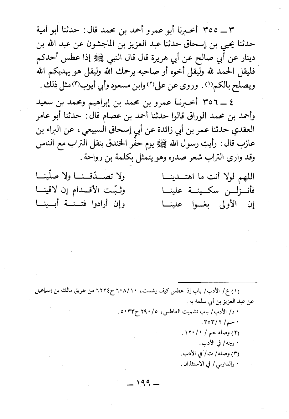 ٣٥٦ - أَخْبَرَنَا عَمْرُو بْنُ مُحَمَّدِ بْنِ إِبْرَاهِيمَ، وَمُحَمَّدُ بْنُ سَعِيدٍ، وَأَحمَدُ بْنُ مُحَمَّدٍ الوَرَّاقُ، قَالُوا: حَدثنا أَحمَدُ بْنُ عِصَامٍ، قَالَ: حَدثنا أَبُو عَامِرٍ العَقَدِيُّ، حَدثنا عُمَرُ بْنُ أَبِي زَائِدَةَ، عَنْ أَبِي إِسْحَاقَ السَّبِيعِيِّ، عَنِ البَرَاءِ بْنِ عَازِبٍ قَالَ: رَأَيْتُ رَسُولَ الله صَلى الله عَليه وسَلم يَوْمَ حَفْرِ الخَنْدَقِ يَنْقُلُ التُّرَابَ مَعَ النَّاسِ وَقَدْ وَارَى التُّرَابُ شَعْرَ صَدْرِهِ وَهُوَ يَتَمَثَّلُ بِكَلِمَةِ ابْنِ رَوَاحَةَ.