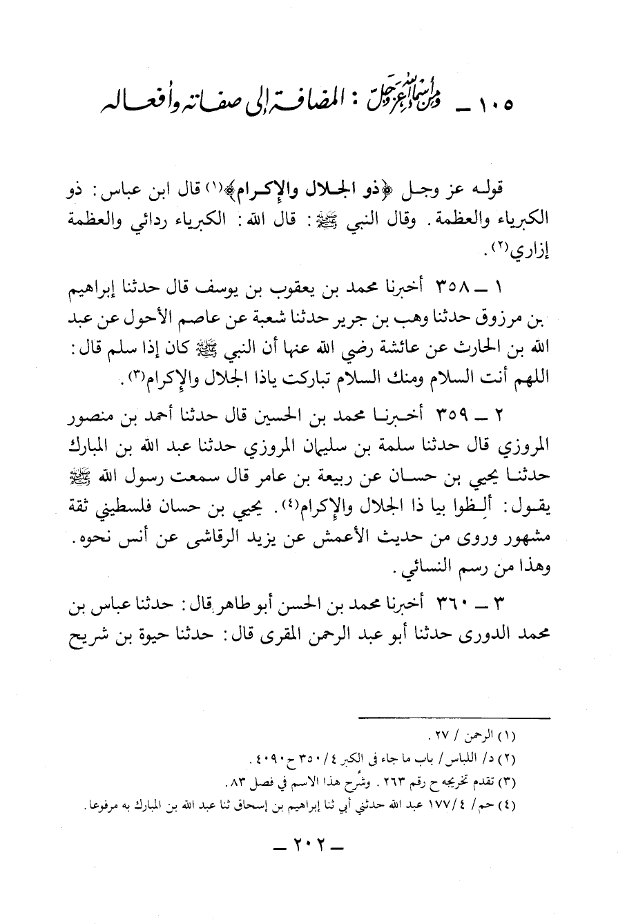 ٣٥٩ - أَخْبَرَنَا مُحَمَّدُ بْنُ الحُسَيْنِ، قَالَ: حَدثنا أَحمَدُ بْنُ مَنْصُورٍ المَرْوَزِيُّ، قَالَ: حَدثنا سَلَمَةُ بْنُ سُلَيْمَانَ المَرْوَزِيُّ، حَدَّثَنا عَبْدُ الله بْنُ المُبَارَكِ، حَدثنا يَحْيَى بْنُ حَسَّانَ، عَنْ رَبِيعَةَ بْنِ عَامِرٍ قَالَ: سَمِعْتُ رَسُولَ الله صَلى الله عَليه وسَلم يَقُولُ: أَلِظُّوا بِيَا ذَا الجَلَالِ وَالإِكْرَامِ.