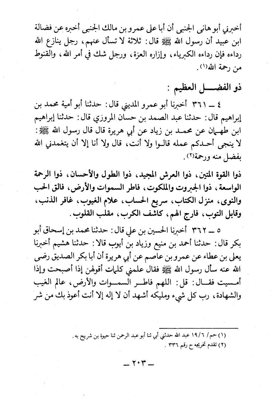 ٣٦٢ - أَخْبَرَنَا الحُسَيْنُ بْنُ عَلِيٍّ، قَالَ: حَدثنا مُحَمَّدُ بْنُ إِسْحَاقَ أَبُو بَكْرٍ، قَالَ: حَدثنا أَحمَدُ بْنُ مَنِيعٍ، وَزِيَادُ بْنُ أَيُّوبَ، قَالَا: حَدثنا هُشَيْمٌ، أَخْبَرَنَا يَعْلَى بْنُ عَطَاءٍ، عَنْ عَمْرِو بْنِ عَاصِمٍ، عَنْ أَبِي هُرَيْرَةَ، أَنَّ أَبَا بَكْرٍ الصِّدِّيقَ، رَضِيَ الله عَنْهُ سَأَلَ رَسُولَ اللهِ صَلى الله عَليه وسَلم فَقَالَ: عَلِّمْنِي كَلِمَاتٍ أَقُولُهُنَّ إِذَا أَصْبَحْتُ وَإِذَا أَمْسَيْتُ فَقَالَ: قُلِ: اللهمَّ فَاطِرَ السَّمَاوَاتِ وَالأَرْضِ عَالِمَ الغَيْبِ وَالشَّهَادَةِ، رَبَّ كُلِّ شَيْءٍ وَمَلِيكَهُ، أَشْهَدُ أَنْ لَا إِلَهَ إِلَاّ أَنْتَ، أَعُوذُ بِكَ مِنْ شَرِّ نَفْسِي وَشَرِّ الشَّيْطَانِ وَشِرْكِهِ فَقَالَ: قُلْهَا إِذَا أَصْبَحْتَ وَإِذَا أَمْسَيْتَ، وَإِذَا أَخَذْتَ مَضْجَعَكَ.