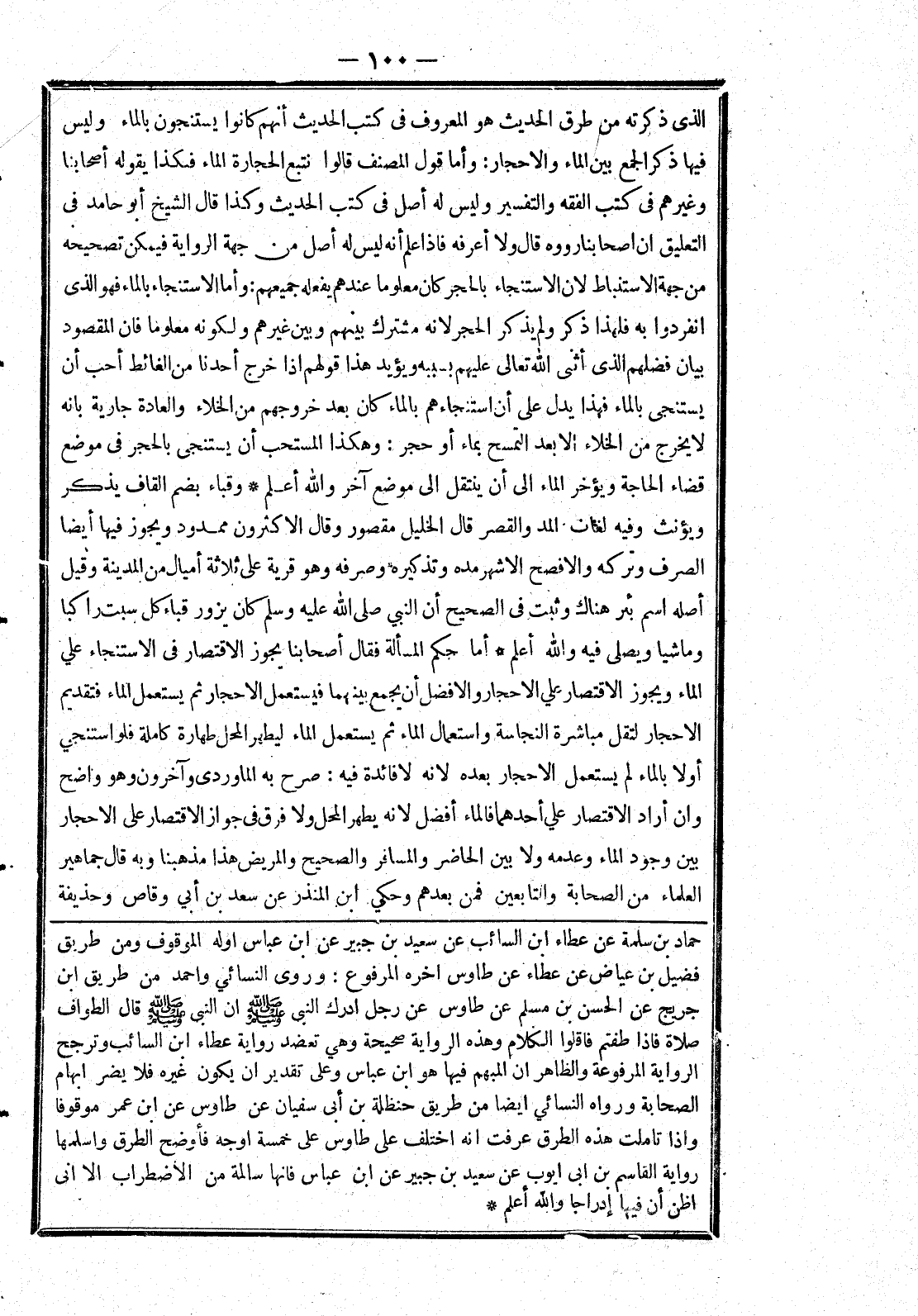 * أَمَّا حُكْمُ الْمَسْأَلَةِ فَقَالَ أَصْحَابُنَا يَجُوزُ الِاقْتِصَارُ فِي الِاسْتِنْجَاءِ عَلَى الْمَاءِ وَيَجُوزُ الِاقْتِصَارُ عَلَى الْأَحْجَارِ وَالْأَفْضَلُ أَنْ يَجْمَعَ بَيْنَهُمَا فَيَسْتَعْمِلُ الْأَحْجَارَ ثُمَّ يَسْتَعْمِلُ الْمَاءَ فَتَقْدِيمُ الْأَحْجَارِ لِتَقِلَّ مُبَاشَرَةُ النَّجَاسَةِ وَاسْتِعْمَالُ الْمَاءِ ثُمَّ يَسْتَعْمِلُ الْمَاءَ لِيُطَهِّرَ الْمَحَلَّ طَهَارَةً كَامِلَةً فَلَوْ اسْتَنْجَى أَوَّلًا بِالْمَاءِ لَمْ يَسْتَعْمِلْ الْأَحْجَارَ بَعْدَهُ لِأَنَّهُ لَا فَائِدَةَ فِيهِ: صَرَّحَ بِهِ الْمَاوَرْدِيُّ وَآخَرُونَ وَهُوَ وَاضِحٌ وَإِنْ أَرَادَ الِاقْتِصَارَ عَلَى أَحَدِهِمَا فَالْمَاءُ أَفْضَلُ لِأَنَّهُ يُطَهِّرُ الْمَحِلَّ وَلَا فَرْقَ فِي جَوَازِ الِاقْتِصَارِ عَلَى الْأَحْجَارِ بَيْنَ وُجُودِ الْمَاءِ وَعَدَمِهِ وَلَا بَيْنَ الْحَاضِرِ وَالْمُسَافِرِ وَالصَّحِيحِ وَالْمَرِيضِ هَذَا مَذْهَبُنَا وَبِهِ قَالَ جَمَاهِيرُ الْعُلَمَاءِ مِنْ الصَّحَابَةِ وَالتَّابِعِينَ فَمَنْ بَعْدَهُمْ وَحَكَى ابْنُ الْمُنْذِرِ عَنْ سَعْدِ بْنِ أَبِي وَقَّاصٍ وَحُذَيْفَةَ