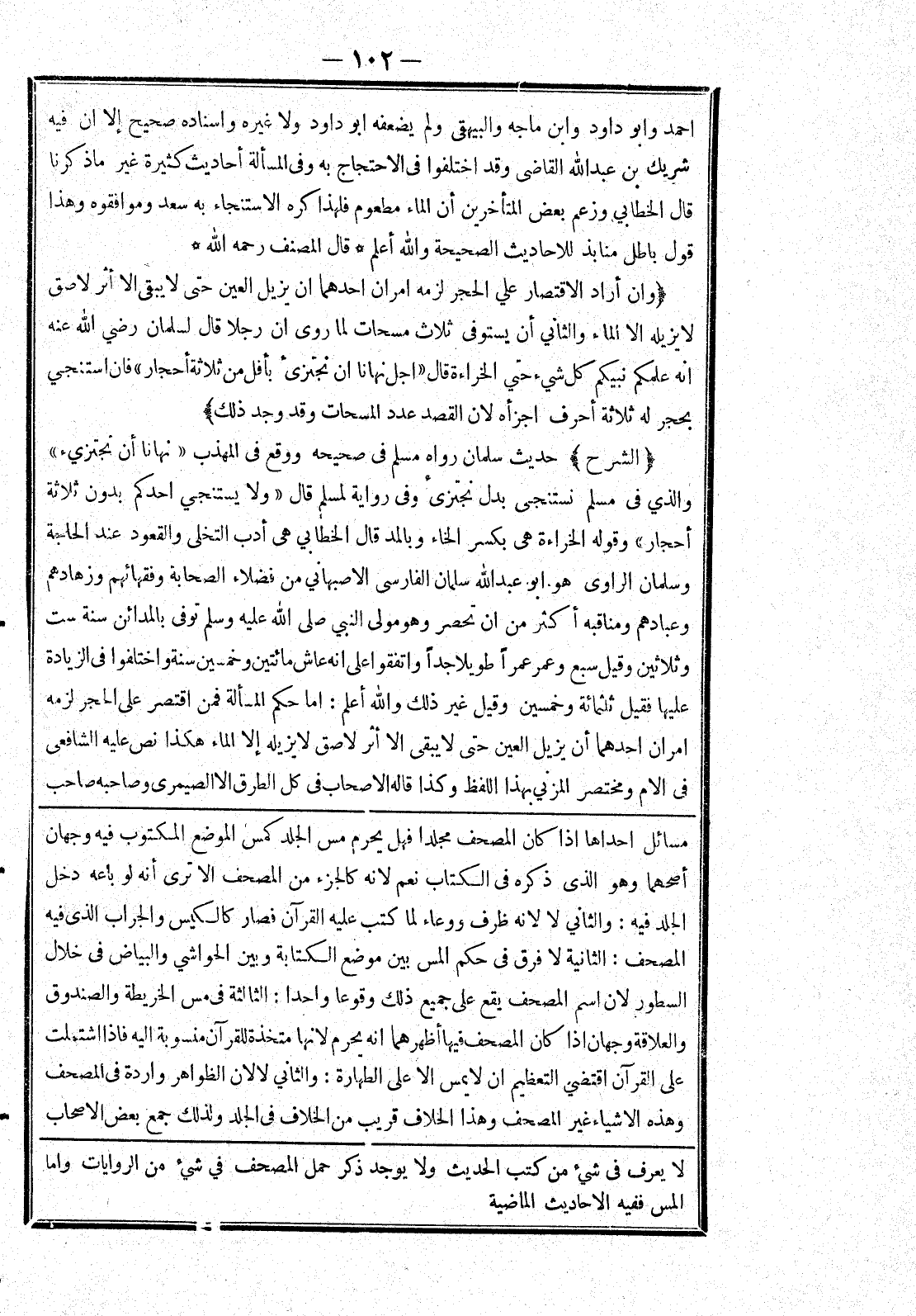 [مسائل احداها إذا كان المصحف مجلدا فهل يحرم مس الجلد كمس الموضع المكتوب فيه وجهان أصحهما وهو الذى ذكره في اكتاب نعم لانه كالجزء من المصحف الا ترى أنه لو باعه دخل الجلد فيه: والثاني لا لانه ظرف ووعاء لما كتب عليه القرآن فصار كالكيس والجراب الذى فيه المصحف: الثانية لا فرق في حكم المس بين موضع الكتابة وبين الحواشي والبياض في خلال السطور لان اسم المصحف يقع على جميع ذلك وقوعا واحدا: الثالثة في مس الخريطة والصندوق والعلاقة وجهان إذا كان المصحف فيها أظهرهما انه يحرم لانها متخذة للقرآن منسوبة إليه فإذا اشتملت على القرآن اقتضي التعظيم ان لا يمس الا على الطهارة: والثاني لا لان الظواهر واردة في المصحف وهذه الاشياء غير المصحف وهذا الخلاف قريب من الاخلاف في الجلد ولذلك جمع بعض الاصحاب]