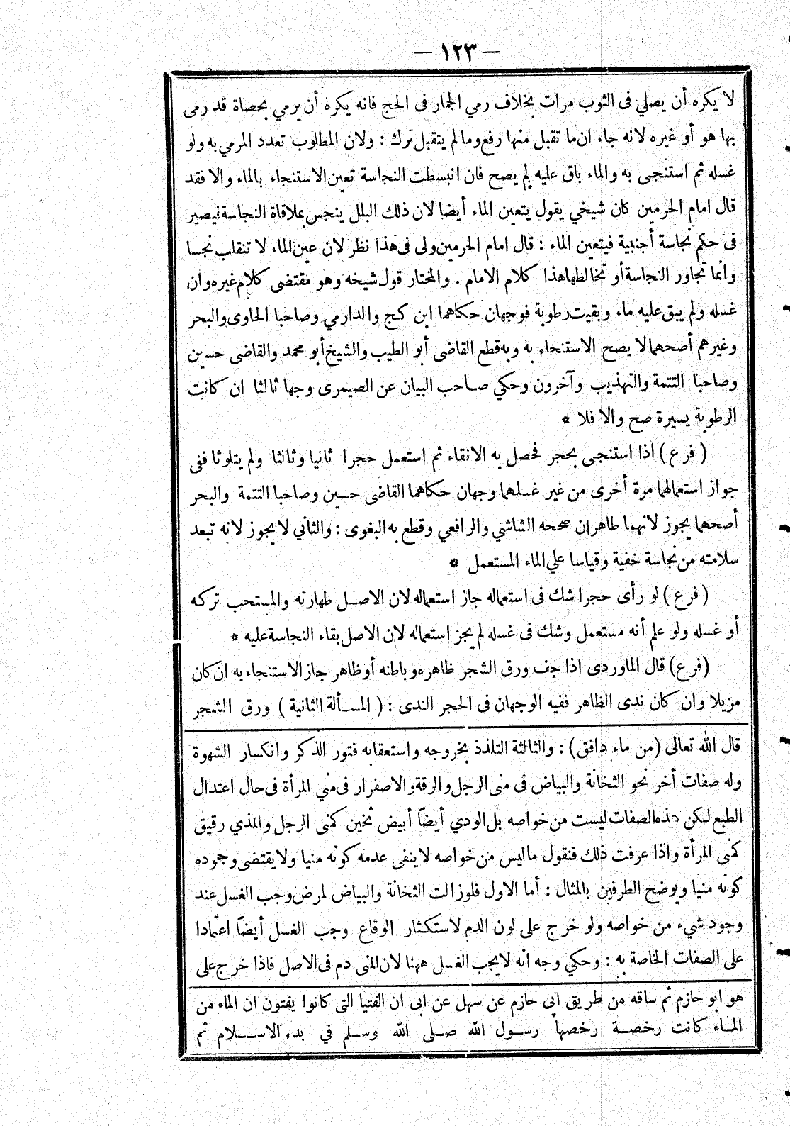 [قال الله تعالى (من ماء دافق) : والثالثة التلذذ بخروجه واستعقابه فتور الذكر وانكسار الشهوة وله صفات أخر نحو الثخانة واليباض في منى الرجل والرقة والاصفرار في مني المرأة في حال اعتدال الطبع لكن هذه الصفات ليست من خواصه بل الودي أيضا أبيض ثخين كمنى الرجل والمذي رقيق
