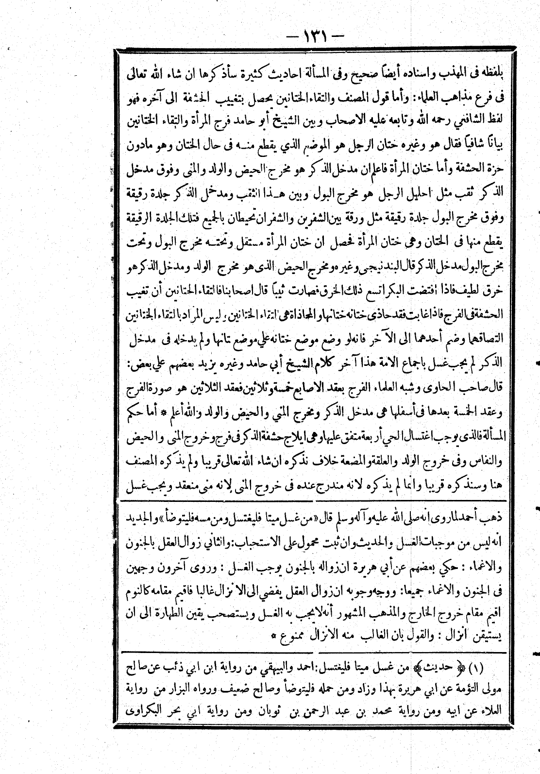 [ذهب أحمد لما روى أنه صلى الله عليه وسلم قال (من غسل ميتا فليغتسل ومن مسه فليتوضأ) والجديد انه ليس من موجبات الغسل والحديث وان ثبت محمول على الاستحباب: والثاني زوال العقل بالجنون والاغماء: حكي بعضهم عن أبي هريرة ان زواله بالجنون يوجب الغسل: وروى آخرون وجهين في الجنون والاغماء جميعا: ووجه وجوبه ان زوال العقل يفضي إلى الانزال غالبا فاقيم مقامه كالنوم اقيم مقام خروج الخارج والمذهب المشهور أنه لا يجب به الغسل ويستصحب يقين الطهارة إلى ان يستيقن انزال: والقول بان الغالب منه الانزال ممنوع] *