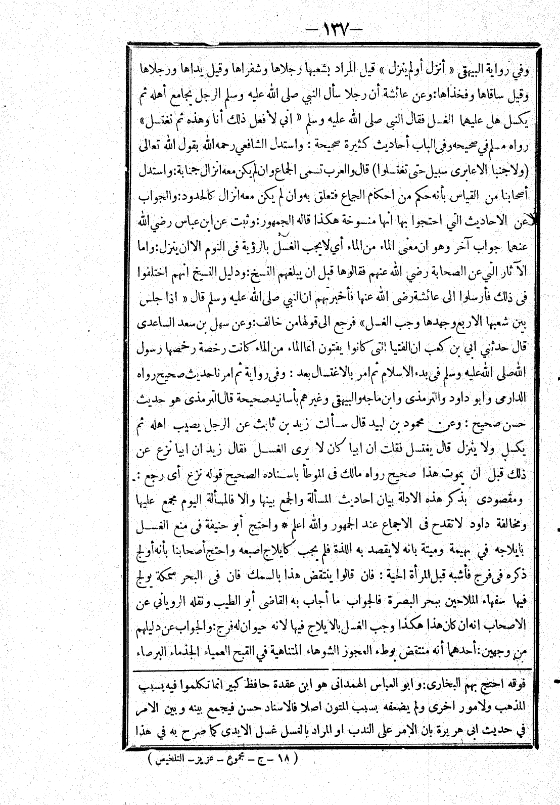 يَكْسَلُ هَلْ عَلَيْهِمَا الْغُسْلُ فَقَالَ النَّبِيُّ صَلَّى اللَّهُ عَلَيْهِ وَسَلَّمَ (إنِّي لَأَفْعَلُ ذَلِكَ أَنَا وَهَذِهِ ثُمَّ نَغْتَسِلُ) رَوَاهُ مُسْلِمٌ فِي صَحِيحِهِ وَفِي الْبَابِ أَحَادِيثُ كَثِيرَةٌ صَحِيحَةٌ: وَاسْتَدَلَّ الشَّافِعِيُّ رَحِمَهُ اللَّهُ بِقَوْلِ اللَّهِ تَعَالَى (وَلا جُنُبًا إِلا عَابِرِي سبيل حتى تغتسلوا) قَالَ وَالْعَرَبُ تُسَمِّي الْجِمَاعَ وَإِنْ لَمْ يَكُنْ مَعَهُ إنْزَالٌ جَنَابَةً: وَاسْتَدَلَّ أَصْحَابُنَا مِنْ الْقِيَاسِ بِأَنَّهُ حُكْمٌ مِنْ أَحْكَامِ الْجِمَاعِ فَتَعَلَّقَ بِهِ وَإِنْ لَمْ يَكُنْ مَعَهُ إنْزَالٌ كَالْحُدُودِ: وَالْجَوَابُ عَنْ الْأَحَادِيثِ الَّتِي احْتَجُّوا بِهَا أَنَّهَا مَنْسُوخَةٌ هَكَذَا قَالَهُ الْجُمْهُورُ: وَثَبَتَ عَنْ ابْنِ عَبَّاسٍ رَضِيَ اللَّهُ عَنْهُمَا جَوَابٌ آخَرُ وَهُوَ أَنَّ مَعْنَى الْمَاءِ مِنْ الْمَاءِ أَيْ لَا يَجِبُ الْغُسْلُ بِالرُّؤْيَةِ فِي النَّوْمِ إلَّا أَنْ يُنْزِلَ: وَأَمَّا الْآثَارُ الَّتِي عَنْ الصَّحَابَةِ رَضِيَ اللَّهُ عَنْهُمْ فَقَالُوهَا قَبْلَ أَنْ يَبْلُغَهُمْ النَّسْخُ: وَدَلِيلُ النَّسْخِ أَنَّهُمْ اخْتَلَفُوا فِي ذَلِكَ فَأَرْسَلُوا إلَى عَائِشَةَ رَضِيَ اللَّهُ عَنْهَا فَأَخْبَرَتْهُمْ إنَّ النَّبِيَّ صَلَّى اللَّهُ عَلَيْهِ وَسَلَّمَ قَالَ (إذَا جَلَسَ بَيْنَ شُعَبِهَا الْأَرْبَعِ وَجَهَدَهَا وَجَبَ الْغُسْلُ) فَرَجَعَ إلَى قَوْلِهَا مَنْ خَالَفَ: وَعَنْ سَهْلِ بْنِ سَعْدٍ السَّاعِدِيِّ قَالَ حَدَّثَنِي أُبَيّ بْنُ كَعْبٍ أَنَّ الْفُتْيَا الَّتِي كَانُوا يُفْتُونَ إنَّمَا الْمَاءُ مِنْ الْمَاءِ كَانَتْ رُخْصَةً رَخَّصَهَا رَسُولِ اللَّهِ صَلَّى اللَّهُ عَلَيْهِ وَسَلَّمَ فِي بَدْءِ الْإِسْلَامِ ثُمَّ أَمَرَ بِالِاغْتِسَالِ بَعْدُ: وَفِي رِوَايَةٍ ثُمَّ أَمَرَنَا حَدِيثٌ صَحِيحٌ رَوَاهُ الدَّارِمِيُّ وَأَبُو دَاوُد وَالتِّرْمِذِيُّ وَابْنُ مَاجَهْ وَالْبَيْهَقِيُّ وَغَيْرُهُمْ بِأَسَانِيدَ صَحِيحَةٍ قَالَ التِّرْمِذِيُّ هُوَ حَدِيثٌ حَسَنٌ صَحِيحٌ: وَعَنْ مَحْمُودِ بْنِ لَبِيدٍ قَالَ سَأَلْت زَيْدَ بْنَ ثَابِتٍ عَنْ الرَّجُلِ يُصِيبُ أَهْلَهُ ثُمَّ يَكْسَلُ وَلَا يُنْزِلُ قَالَ يَغْتَسِلُ فَقُلْت إنَّ أُبَيًّا كَانَ لَا يَرَى الْغُسْلَ فَقَالَ زَيْدٌ إنَّ أُبَيًّا نَزَعَ عَنْ ذَلِكَ قَبْلَ أَنْ يَمُوتَ هَذَا صَحِيحٌ رَوَاهُ مَالِكٌ فِي الْمُوَطَّأِ بِإِسْنَادِهِ الصَّحِيحِ قَوْلُهُ نَزَعَ أَيْ رَجَعَ: وَمَقْصُودِي بِذِكْرِ هَذِهِ الْأَدِلَّةِ بَيَانُ أَحَادِيثِ الْمَسْأَلَةِ وَالْجَمْعُ بَيْنَهَا وَإِلَّا فَالْمَسْأَلَةُ الْيَوْمَ مُجْمَعٌ عَلَيْهَا وَمُخَالَفَةُ دَاوُد لَا تَقْدَحُ فِي الْإِجْمَاعِ عِنْدَ الْجُمْهُورِ وَاَللَّهُ أَعْلَمُ