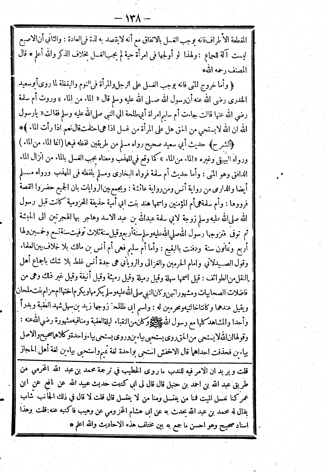 * [الشَّرْحُ] حَدِيثُ أَبِي سَعِيدٍ صَحِيحٌ رَوَاهُ مُسْلِمٌ مِنْ طَرِيقَيْنِ لَفْظُهُ فِيهِمَا (إنَّمَا الْمَاءُ مِنْ الْمَاءِ) وَرَوَاهُ الْبَيْهَقِيُّ وَغَيْرُهُ (الْمَاءُ مِنْ الْمَاءِ) كما وقع في المهذب ومعناه يَجِبُ الْغُسْلُ بِالْمَاءِ مِنْ إنْزَالِ الْمَاءِ الدَّافِقِ وهو المنى: وأما حَدِيثُ أُمِّ سَلَمَةَ فَرَوَاهُ الْبُخَارِيُّ وَمُسْلِمٌ بِلَفْظِهِ فِي الْمُهَذَّبِ وَرَوَاهُ مُسْلِمٌ أَيْضًا وَالدَّارِمِيُّ مِنْ رِوَايَةِ أَنَسٍ وَمِنْ رِوَايَةِ عَائِشَةَ: وَيُجْمَعُ بَيْنَ الرِّوَايَاتِ بِأَنَّ الْجَمِيعَ حَضَرُوا الْقِصَّةَ فَرَوَوْهَا: وَأُمُّ سَلَمَةَ هِيَ أُمُّ الْمُؤْمِنِينَ وَاسْمُهَا هِنْدُ بِنْتُ أَبِي أُمَيَّةَ حُذَيْفَةُ الْمَخْزُومِيَّةُ كَانَتْ قَبْلَ رَسُولِ اللَّهِ صَلَّى اللَّهُ عَلَيْهِ وَسَلَّمَ زَوْجَةً لِأَبِي سَلَمَةَ عَبْدِ اللَّهِ بْنِ عَبْدِ الْأَسَدِ وَهَاجَرَ بِهَا الْهِجْرَتَيْنِ إلَى الْحَبَشَةِ ثُمَّ تُوُفِّيَ فَتَزَوَّجَهَا رَسُولُ اللَّهِ صَلَّى اللَّهُ عَلَيْهِ وَسَلَّمَ سَنَةَ أَرْبَعٍ وَقِيلَ سَنَةَ ثَلَاثٍ تُوُفِّيَتْ سَنَةَ تِسْعٍ وَخَمْسِينَ وَلَهَا أَرْبَعٌ وَثَمَانُونَ سَنَةً وَدُفِنَتْ بِالْبَقِيعِ: وَأَمَّا أُمُّ سُلَيْمٍ فَهِيَ أُمُّ أَنَسِ بْنِ مَالِكٍ بِلَا خِلَافٍ بَيْنَ الْعُلَمَاءِ وَقَوْلُ الصَّيْدَلَانِيِّ وَإِمَامِ الْحَرَمَيْنِ وَالْغَزَالِيِّ وَالرُّويَانِيِّ هِيَ جَدَّةُ أَنَسٍ غَلَطٌ بِلَا شَكٍّ بِإِجْمَاعِ أَهْلِ النَّقْلِ مِنْ الطَّوَائِفِ: قِيلَ اسْمُهَا سَهْلَةُ وَقِيلَ رُمَيْلَةُ وَقِيلَ رميثة وقيل أنيفة وَقِيلَ غَيْرُ ذَلِكَ وَهِيَ مِنْ فَاضِلَاتِ الصَّحَابِيَّاتِ وَمَشْهُورَاتهنَّ وَكَانَ النَّبِيُّ صَلَّى اللَّهُ عَلَيْهِ وَسَلَّمَ يكرمها ويكرم اختها ام حزام بِنْتَ مِلْحَانَ وَيُقِيلُ عِنْدَهُمَا وَكَانَتَا خَالَتَيْهِ وَمَحْرَمَيْنِ لَهُ: وَاسْمُ أَبِي طَلْحَةَ زَوْجِهَا زَيْدُ بْنُ سَهْلٍ شَهِدَ الْعَقَبَةَ وَبَدْرًا وَأُحُدًا وَالْمَشَاهِدَ كُلَّهَا مَعَ رَسُولِ اللَّهِ صَلَّى اللَّهُ عَلَيْهِ وَسَلَّمَ وَكَانَ مِنْ النُّقَبَاءِ لَيْلَةَ الْعَقَبَةِ وَمَنَاقِبُهُ مَشْهُورَةٌ رضي الله عنه: وَقَوْلُهَا إنَّ اللَّهَ لَا يَسْتَحِي مِنْ الْحَقِّ رُوِيَ يَسْتَحْيِي بِيَاءَيْنِ وَرُوِيَ يَسْتَحِي بِيَاءٍ وَاحِدَةٍ وَكِلَاهُمَا صَحِيحٌ وَالْأَصْلُ بِيَاءَيْنِ فَحُذِفَتْ إحْدَاهُمَا قَالَ الْأَخْفَشُ أَسْتَحِي بِوَاحِدَةٍ لُغَةُ تَمِيمٍ وَأَسْتَحْيِي بِيَاءَيْنِ لُغَةُ أَهْلِ الْحِجَازِ