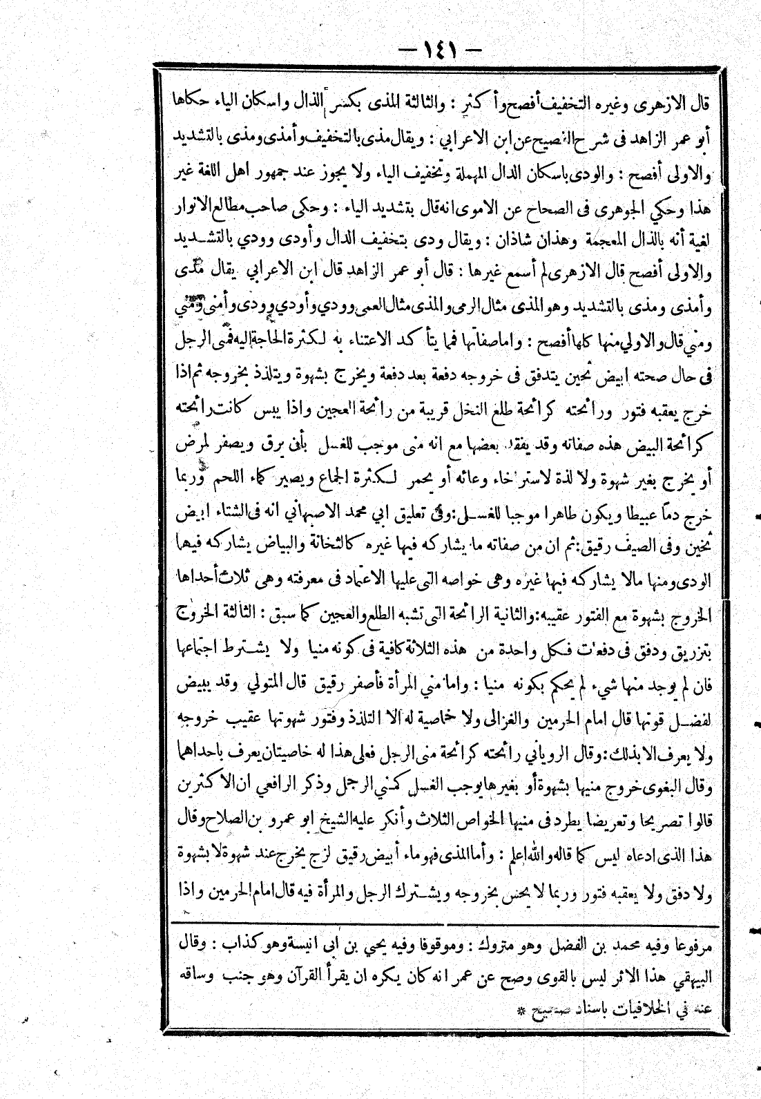 قَالَ الْأَزْهَرِيُّ وَغَيْرُهُ التَّخْفِيفُ أَفْصَحُ وَأَكْثَرُ: وَالثَّالِثَةُ الْمَذْيِ بِكَسْرِ الذَّالِ وَإِسْكَانِ الْيَاءِ حَكَاهَا أَبُو عُمَرَ الزَّاهِدُ فِي شَرْحِ الْفَصِيحِ عَنْ ابْنِ الْأَعْرَابِيِّ: وَيُقَالُ مَذَى بِالتَّخْفِيفِ وَأَمْذَى وَمَذَّى بِالتَّشْدِيدِ وَالْأُولَى أَفْصَحُ: وَالْوَدْيُ بِإِسْكَانِ الدَّالِ الْمُهْمَلَةِ وَتَخْفِيفِ الْيَاءِ وَلَا يَجُوزُ عِنْدَ جُمْهُورِ أَهْلِ اللُّغَةِ غَيْرُ هَذَا وَحَكَى الْجَوْهَرِيُّ فِي الصِّحَاحِ عَنْ الْأُمَوِيِّ أَنَّهُ قَالَ بِتَشْدِيدِ الْيَاءِ: وَحَكَى صَاحِبُ مطالع الانوار لغية أَنَّهُ بِالذَّالِ الْمُعْجَمَةِ وَهَذَانِ شَاذَانَ: وَيُقَالُ وَدَى بتخفيف الدال وأودى وَوَدَّى بِالتَّشْدِيدِ وَالْأُولَى أَفْصَحُ قَالَ الْأَزْهَرِيُّ لَمْ أَسْمَعْ غَيْرَهَا: قَالَ أَبُو عُمَرَ الزَّاهِدُ قَالَ ابْنُ الْأَعْرَابِيِّ يُقَالُ مَذَى وَأَمْذَى وَمَذَّى بِالتَّشْدِيدِ وَهُوَ الْمَذْيُ مِثَالُ الرَّمْيِ وَالْمَذَى مِثَالُ الْعَمَى وَوَدَى وَأَوْدَى وَوَدَّى وَأَمْنَى وَمَنَى وَمَنَّى قَالَ وَالْأُولَى مِنْهَا كُلِّهَا أَفْصَحُ: وَأَمَّا صِفَاتُهَا فَمِمَّا يَتَأَكَّدُ الِاعْتِنَاءُ بِهِ لِكَثْرَةِ الْحَاجَةِ إلَيْهِ فَمَنِيُّ الرجل في حال صحته ابيض ثحين يَتَدَفَّقُ فِي خُرُوجِهِ دَفْعَةً بَعْدَ دَفْعَةٍ وَيَخْرُجُ بِشَهْوَةٍ وَيُتَلَذَّذُ بِخُرُوجِهِ ثُمَّ إذَا خَرَجَ يَعْقُبُهُ فُتُورٌ وَرَائِحَتُهُ كَرَائِحَةِ طَلْعِ النَّخْلِ قَرِيبَةٌ مِنْ رَائِحَةِ الْعَجِينِ وَإِذَا يَبِسَ كَانَتْ رَائِحَتُهُ كَرَائِحَةِ الْبَيْضِ هَذِهِ صِفَاتُهُ وَقَدْ يُفْقَدُ بَعْضُهَا مَعَ أَنَّهُ مَنِيٌّ مُوجِبٌ لِلْغُسْلِ بِأَنْ يَرِقَّ وَيَصْفَرَّ لِمَرَضٍ أَوْ يَخْرُجَ بِغَيْرِ شَهْوَةٍ وَلَا لَذَّةٍ لِاسْتِرْخَاءِ وِعَائِهِ أَوْ يَحْمَرَّ لِكَثْرَةِ الْجِمَاعِ وَيَصِيرَ كَمَاءِ اللَّحْمِ وَرُبَّمَا خَرَجَ دَمًا عَبِيطًا وَيَكُونُ طَاهِرًا مُوجِبًا لِلْغُسْلِ: وَفِي تَعْلِيقِ أَبِي مُحَمَّدٍ الْأَصْبَهَانِيِّ أَنَّهُ فِي الشِّتَاءِ أَبْيَضُ ثَخِينٌ وَفِي الصَّيْفِ رَقِيقٌ: ثُمَّ إنَّ مِنْ صِفَاتِهِ مَا يشاركه فيها غيره كالثخانة والبياض يشاركه فيهما الودى ومنها مالا يُشَارِكُهُ فِيهَا غَيْرُهُ وَهِيَ خَوَاصُّهُ الَّتِي عَلَيْهَا الِاعْتِمَادُ فِي مَعْرِفَتِهِ وَهِيَ ثَلَاثٌ إحْدَاهَا الْخُرُوجُ بِشَهْوَةٍ مَعَ الْفُتُورِ عَقِيبَهُ: وَالثَّانِيَةُ الرَّائِحَةُ الَّتِي تشبه الطلع والعجين كما سبق: الثالثة الْخُرُوجُ بِتَزْرِيقٍ وَدَفْقٍ فِي دَفَعَاتٍ فَكُلُّ وَاحِدَةٍ مِنْ هَذِهِ الثَّلَاثَةِ كَافِيَةً فِي كَوْنِهِ مَنِيًّا وَلَا يُشْتَرَطُ اجْتِمَاعُهَا فَإِنْ لَمْ يُوجَدْ مِنْهَا شئ لَمْ يُحْكَمْ بِكَوْنِهِ مَنِيًّا: وَأَمَّا مَنِيُّ الْمَرْأَةِ فَأَصْفَرُ رَقِيقٌ قَالَ الْمُتَوَلِّي وَقَدْ يَبْيَضُّ لِفَضْلِ قُوَّتِهَا قَالَ إمَامُ الْحَرَمَيْنِ وَالْغَزَالِيُّ وَلَا خَاصِّيَّةَ لَهُ إلَّا التَّلَذُّذُ وَفُتُورُ شَهْوَتِهَا عَقِيبَ خُرُوجِهِ