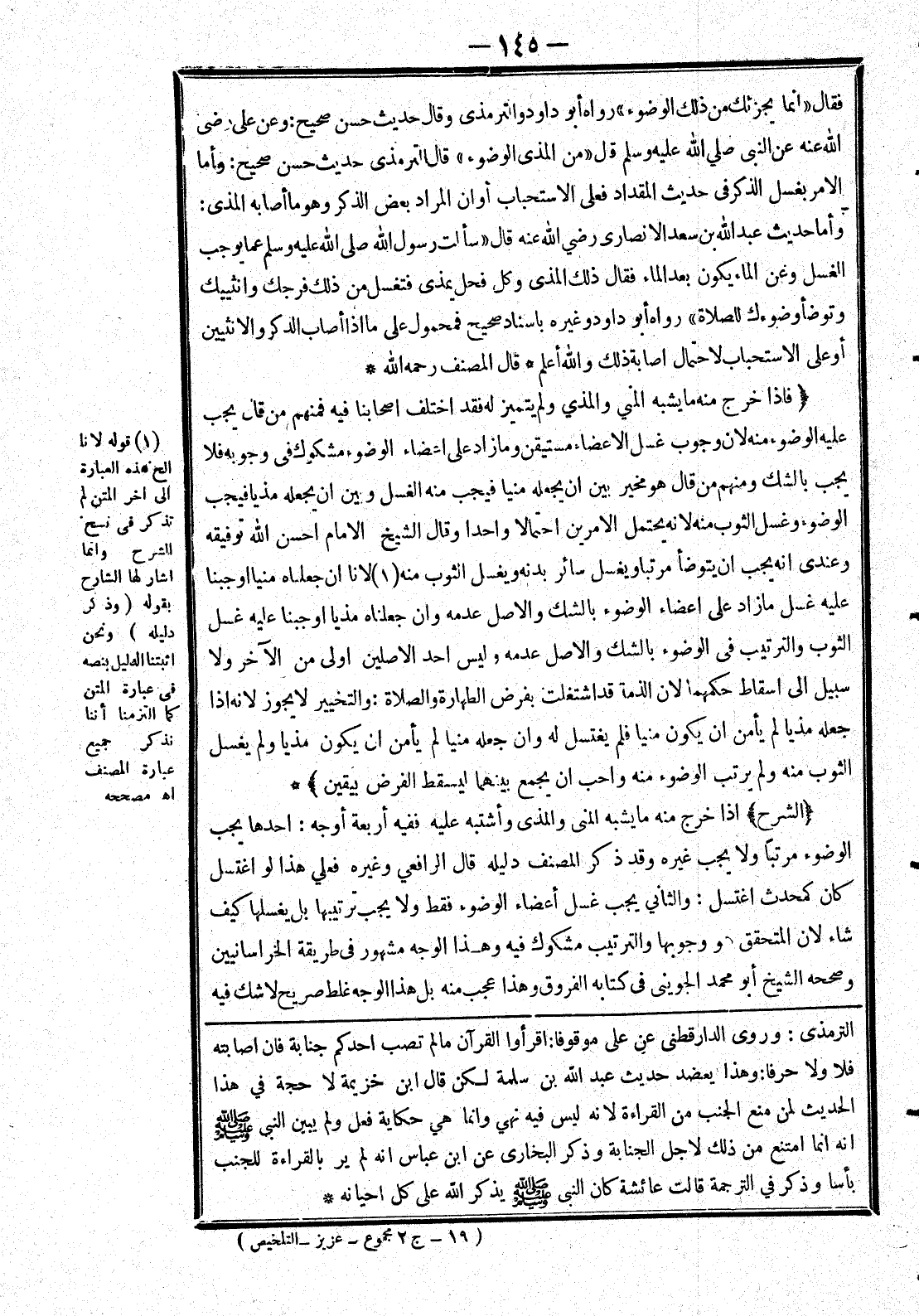 وَأَمَّا حَدِيثُ عَبْدِ اللَّهِ بْنِ سَعْدٍ الْأَنْصَارِيِّ رَضِيَ اللَّهُ عَنْهُ قَالَ (سَأَلْتُ رَسُولَ اللَّهِ صَلَّى اللَّهُ عَلَيْهِ وَسَلَّمَ عَمَّا يُوجِبُ الْغُسْلَ وَعَنْ الْمَاءِ يَكُونُ بَعْدَ الْمَاءِ فَقَالَ ذَلِكَ الْمَذْيُ وَكُلُّ فَحْلٍ يُمْذِي فَتَغْسِلُ مِنْ ذَلِكَ فَرْجَك وَأُنْثَيَيْك وَتَوَضَّأْ وُضُوءَك لِلصَّلَاةِ) رَوَاهُ أَبُو دَاوُد وَغَيْرُهُ بِإِسْنَادٍ صَحِيحٍ فَمَحْمُولٌ عَلَى مَا إذَا أَصَابَ الذَّكَرَ وَالْأُنْثَيَيْنِ أَوْ عَلَى الِاسْتِحْبَابِ لِاحْتِمَالِ إصَابَةِ ذَلِكَ وَاَللَّهُ أعلم * قال المصنف رحمه الله