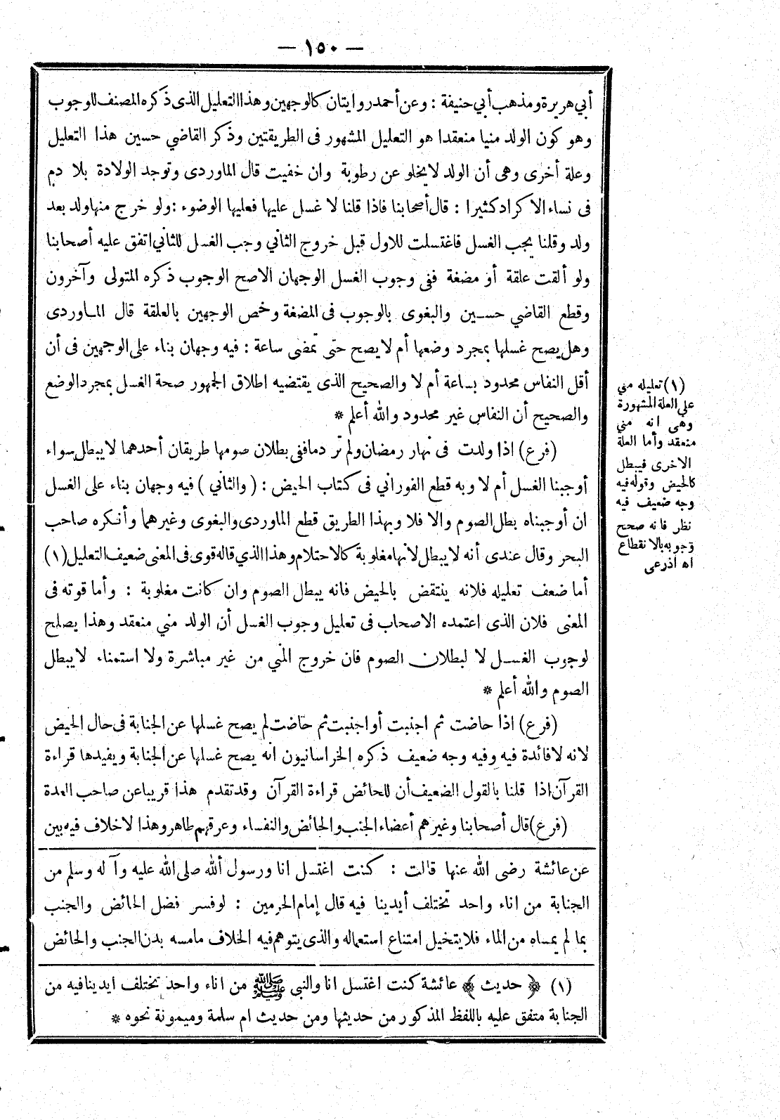 [عن عائشة رضى الله عنها قالت: كنت اغتسل انا ورسول الله صلى الله عليه وسلم من الجنابة من اناء واحد تختلف أيدينا فيه قال إمام الحرمين: لو فسر فضل الحائض والجنب بما لم يمساه من الماء فلا يتخيل امتناع استعماله والذى يتوهم فيه الخلاف ما مسه بدن الجنب والحائض]