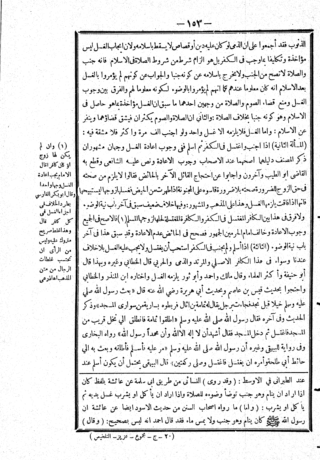 الذُّنُوبِ فَقَدْ أَجْمَعُوا عَلَى أَنَّ الذِّمِّيَّ لَوْ كن عَلَيْهِ دَيْنٌ أَوْ قِصَاصٌ لَا يَسْقُطُ بِإِسْلَامِهِ وَلِأَنَّ إيجَابَ الْغُسْلِ لَيْسَ مُؤَاخَذَةً وَتَكْلِيفًا بِمَا وَجَبَ فِي الْكُفْرِ بَلْ هُوَ إلْزَامُ شَرْطٍ مِنْ شُرُوطِ الصَّلَاةِ فِي الْإِسْلَامِ فَإِنَّهُ جُنُبٌ وَالصَّلَاةُ لَا تَصِحُّ مِنْ الْجُنُبِ وَلَا يَخْرُجُ بِإِسْلَامِهِ عَنْ كَوْنِهِ جُنُبًا وَالْجَوَابُ عَنْ كَوْنِهِمْ لَمْ يُؤْمَرُوا بِالْغُسْلِ بَعْدَ الْإِسْلَامِ أَنَّهُ كَانَ مَعْلُومًا عِنْدَهُمْ كَمَا أَنَّهُمْ لَمْ يُؤْمَرُوا بِالْوُضُوءِ لِكَوْنِهِ مَعْلُومًا لَهُمْ وَالْفَرْقُ بَيْنَ وُجُوبِ الْغُسْلِ وَمَنْعِ قَضَاءِ الصَّوْمِ وَالصَّلَاةِ مِنْ وَجْهَيْنِ أَحَدُهُمَا مَا سَبَقَ أَنَّ الْغُسْلَ مُؤَاخَذَةٌ بِمَا هُوَ حَاصِلٌ فِي الْإِسْلَامِ وَهُوَ كَوْنُهُ جُنُبًا بِخِلَافِ الصَّلَاةِ: وَالثَّانِي أَنَّ الصَّلَاةَ وَالصَّوْمَ يَكْثُرَانِ فَيَشُقُّ قَضَاؤُهُمَا وَيُنَفِّرُ عَنْ الْإِسْلَامِ: وَأَمَّا الْغُسْلُ فَلَا يَلْزَمُهُ إلَّا غُسْلٌ وَاحِدٌ وَلَوْ أَجْنَبَ أَلْفَ مَرَّةٍ وَأَكْثَرَ فَلَا مَشَقَّةَ فِيهِ: (الْمَسْأَلَةُ الثَّانِيَةُ) إذَا أَجْنَبَ وَاغْتَسَلَ فِي الْكُفْرِ ثُمَّ أَسْلَمَ فَفِي وُجُوبِ إعَادَةِ الْغُسْلِ وَجْهَانِ مَشْهُورَانِ ذَكَرَ الْمُصَنِّفُ دَلِيلَهُمَا أَصَحُّهُمَا عِنْدَ الْأَصْحَابِ وُجُوبُ الْإِعَادَةِ وَنَصَّ عَلَيْهِ الشَّافِعِيُّ وَقَطَعَ بِهِ الْقَاضِي أَبُو الطَّيِّبِ وَآخَرُونَ وَأَجَابُوا عَنْ احْتِجَاجِ الْقَائِلِ الْآخَرِ بِالْحَائِضِ فَقَالُوا لَا يَلْزَمُ مِنْ صِحَّتِهِ فِي حَقِّ الزَّوْجِ لِلضَّرُورَةِ صِحَّتُهُ بِلَا ضَرُورَةٍ قَاسُوهُ عَلَى الْمَجْنُونَةِ إذَا طَهُرَتْ مِنْ الْحَيْضِ فَغَسَّلَهَا زوجها ليستبيحها فانها إذا فاقت يلزمها الغسل وهذا على المذهب والمشهور: وَفِيهَا خِلَافٌ ضَعِيفٌ سَبَقَ فِي آخِرِ بَابِ نِيَّةِ الْوُضُوءِ وَلَا فَرْقَ فِي هَذَا بَيْنَ الْكَافِرِ الْمُغْتَسِلِ فِي الْكُفْرِ وَالْكَافِرَةِ الْمُغْتَسِلَةِ لِحِلِّهَا لِزَوْجِهَا الْمُسْلِمِ (1) فَالْأَصَحُّ فِي الْجَمِيعِ وُجُوبُ الْإِعَادَةِ وَخَالَفَ إمَامُ الْحَرَمَيْنِ الْجُمْهُورَ فَصَحَّحَ فِي الْحَائِضِ عَدَمَ الْإِعَادَةِ وَقَدْ سَبَقَ هَذَا فِي آخِرِ بَابِ نِيَّةِ الْوُضُوءِ (الثَّالِثَةُ) إذَا أَسْلَمَ وَلَمْ يُجْنِبْ فِي الْكُفْرِ اُسْتُحِبَّ أَنْ يَغْتَسِلَ وَلَا يَجِبُ عَلَيْهِ الْغُسْلُ بِلَا خِلَافٍ عِنْدَنَا وَسَوَاءٌ فِي هَذَا الْكَافِرُ الْأَصْلِيُّ وَالْمُرْتَدُّ وَالذِّمِّيُّ وَالْحَرْبِيُّ قَالَ الْخَطَّابِيُّ وَغَيْرُهُ وَبِهَذَا قَالَ أَبُو حَنِيفَةَ وَأَكْثَرُ الْعُلَمَاءِ وَقَالَ مَالِكٌ وَأَحْمَدُ وَأَبُو ثَوْرٍ يَلْزَمُهُ الْغُسْلُ وَاخْتَارَهُ ابْنُ الْمُنْذِرِ وَالْخَطَّابِيُّ