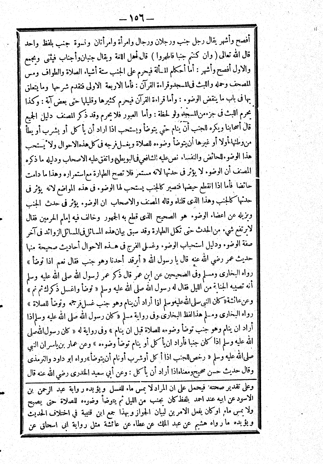قَالَ أَصْحَابُنَا وَيُكْرَهُ لِلْجُنُبِ أَنْ يَنَامَ حَتَّى يَتَوَضَّأَ وَيُسْتَحَبُّ إذَا أَرَادَ أَنْ يَأْكُلَ أَوْ يَشْرَبَ أَوْ يَطَأَ مَنْ وَطِئَهَا أَوَّلًا أَوْ غَيْرَهَا أَنْ يَتَوَضَّأَ وُضُوءَهُ لِلصَّلَاةِ وَيَغْسِلَ فَرْجَهُ فِي كُلِّ هَذِهِ الْأَحْوَالِ وَلَا يُسْتَحَبُّ هَذَا الْوُضُوءُ لِلْحَائِضِ وَالنُّفَسَاءِ نَصَّ عَلَيْهِ الشَّافِعِيُّ فِي الْبُوَيْطِيِّ وَاتَّفَقَ عَلَيْهِ الْأَصْحَابُ وَدَلِيلُهُ مَا ذَكَرَهُ الْمُصَنِّفُ أَنَّ الْوُضُوءَ لَا يُؤَثِّرُ فِي حَدَثِهَا لِأَنَّهُ مُسْتَمِرٌّ فَلَا تَصِحُّ الطَّهَارَةُ مَعَ اسْتِمْرَارِهِ وَهَذَا مَا دَامَتْ حَائِضًا فَأَمَّا إذَا انْقَطَعَ حَيْضُهَا فَتَصِيرُ كَالْجُنُبِ يُسْتَحَبُّ لَهَا الْوُضُوءُ فِي هَذِهِ الْمَوَاضِعِ لِأَنَّهُ يُؤَثِّرُ فِي حَدَثِهَا كَالْجُنُبِ وَهَذَا الَّذِي قُلْنَاهُ وَقَالَهُ الْمُصَنِّفُ وَالْأَصْحَابُ إنَّ الْوُضُوءَ يُؤَثِّرُ فِي حَدَثِ الْجُنُبِ وَيُزِيلُهُ عَنْ أَعْضَاءِ الْوُضُوءِ هُوَ الصَّحِيحُ الَّذِي قَطَعَ بِهِ الْجُمْهُورُ وَخَالَفَ فِيهِ إمَامُ الْحَرَمَيْنِ فَقَالَ لَا يرتفع شئ مِنْ الْحَدَثِ حَتَّى تَكْمُلَ الطَّهَارَةُ وَقَدْ سَبَقَ بَيَانُ هَذِهِ الْمَسَائِلِ فِي الْمَسَائِلِ الزَّوَائِدِ فِي آخِرِ صِفَةِ الْوُضُوءِ وَدَلِيلُ اسْتِحْبَابِ الْوُضُوءِ وَغَسْلِ الْفَرْجِ فِي هَذِهِ الْأَحْوَالِ أَحَادِيثُ صَحِيحَةٌ مِنْهَا حَدِيثُ عُمَرَ رَضِيَ اللَّهُ عَنْهُ قَالَ يَا رَسُولَ اللَّهِ (أَيَرْقُدُ أَحَدُنَا وَهُوَ جُنُبٌ فَقَالَ نَعَمْ إذَا تَوَضَّأَ) رَوَاهُ الْبُخَارِيُّ وَمُسْلِمٌ وَفِي الصَّحِيحَيْنِ عَنْ ابْنِ عُمَرَ قَالَ ذَكَرَ عُمَرُ لِرَسُولِ اللَّهِ صَلَّى اللَّهُ عَلَيْهِ وَسَلَّمَ أَنَّهُ تُصِيبُهُ الْجَنَابَةُ مِنْ اللَّيْلِ فَقَالَ لَهُ رَسُولُ اللَّهِ صَلَّى اللَّهُ عَلَيْهِ وَسَلَّمَ (تَوَضَّأْ وَاغْسِلْ ذَكَرَك ثُمَّ نَمْ) وَعَنْ عَائِشَةَ (كَانَ النَّبِيُّ صَلَّى اللَّهُ عَلَيْهِ وَسَلَّمَ إذَا أَرَادَ أَنْ يَنَامَ وَهُوَ جُنُبٌ غَسَلَ فَرْجَهُ وَتَوَضَّأَ لِلصَّلَاةِ) رَوَاهُ الْبُخَارِيُّ وَمُسْلِمٌ هَذَا لَفْظُ الْبُخَارِيِّ وَفِي رِوَايَةِ مُسْلِمٍ (كَانَ رَسُولُ اللَّهِ صَلَّى اللَّهُ عَلَيْهِ وَسَلَّمَ إذَا أَرَادَ أَنْ يَنَامَ وَهُوَ جُنُبٌ تَوَضَّأَ وُضُوءَهُ لِلصَّلَاةِ قَبْلَ أَنْ يَنَامَ) وَفِي رِوَايَةٍ لَهُ (كَانَ رَسُولُ اللَّهِ صَلَّى اللَّهُ عَلَيْهِ وَسَلَّمَ إذَا كَانَ جُنُبًا فَأَرَادَ أَنْ يَأْكُلَ أَوْ يَنَامَ تَوَضَّأَ وُضُوءَهُ) وَعَنْ عَمَّارِ بْنِ يَاسِرٍ أَنَّ النَّبِيَّ صَلَّى اللَّهُ عَلَيْهِ وَسَلَّمَ (رَخَّصَ لِلْجُنُبِ إذَا أَكَلَ أَوْ شَرِبَ أَوْ نَامَ أَنْ يَتَوَضَّأَ) رَوَاهُ أَبُو دَاوُد وَالتِّرْمِذِيُّ وَقَالَ حَدِيثٌ حَسَنٌ صَحِيحٌ وَمَعْنَاهُ إذا أراد أن يأكل: وَعَنْ أَبِي سَعِيدٍ الْخُدْرِيِّ رَضِيَ اللَّهُ عَنْهُ قَالَ