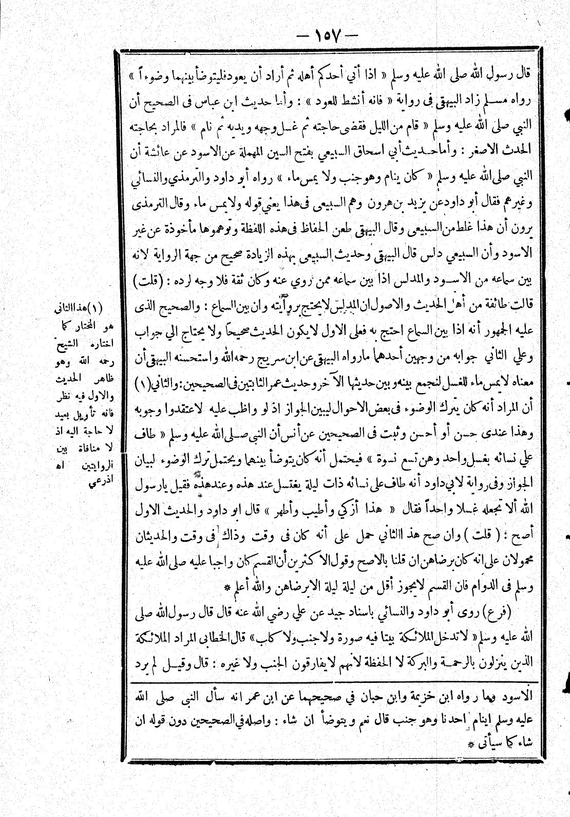 الْحَدَثُ الْأَصْغَرُ: وَأَمَّا حَدِيثُ أَبِي إِسْحَاقَ السَّبِيعِيِّ بِفَتْحِ السِّينِ الْمُهْمَلَةِ عَنْ الْأَسْوَدِ عَنْ عَائِشَةَ أَنَّ النَّبِيَّ صَلَّى اللَّهُ عَلَيْهِ وَسَلَّمَ (كَانَ يَنَامُ وَهُوَ جُنُبٌ وَلَا يَمَسُّ مَاءً) رَوَاهُ أَبُو دَاوُد وَالتِّرْمِذِيُّ وَالنَّسَائِيُّ وَغَيْرُهُمْ فَقَالَ أَبُو دَاوُد عَنْ يَزِيدَ بْنِ هرون وَهَمَ السَّبِيعِيُّ فِي هَذَا يَعْنِي قَوْلَهُ وَلَا يَمَسُّ مَاءً وَقَالَ التِّرْمِذِيُّ يَرَوْنَ أَنَّ هَذَا غَلَطٌ مِنْ السَّبِيعِيِّ وَقَالَ الْبَيْهَقِيُّ طَعَنَ الْحُفَّاظُ فِي هَذِهِ اللَّفْظَةِ وَتَوَهَّمُوهَا مَأْخُوذَةً عَنْ غَيْرِ الْأَسْوَدِ وَأَنَّ السَّبِيعِيَّ دَلَّسَ قَالَ الْبَيْهَقِيُّ وَحَدِيثُ السَّبِيعِيِّ بِهَذِهِ الزِّيَادَةِ صَحِيحٌ مِنْ جِهَةِ الرِّوَايَةِ لِأَنَّهُ بَيَّنَ سَمَاعَهُ مِنْ الْأَسْوَدِ وَالْمُدَلِّسُ إذَا بَيَّنَ سَمَاعَهُ مِمَّنْ رَوَى عَنْهُ وَكَانَ ثِقَةً فَلَا وَجْهَ لِرَدِّهِ: (قُلْت) قَالَتْ طَائِفَةٌ مِنْ أَهْلِ الْحَدِيثِ وَالْأُصُولِ إنَّ الْمُدَلِّسَ لَا يُحْتَجُّ بِرِوَايَتِهِ وَإِنْ بَيَّنَ السَّمَاعَ: وَالصَّحِيحُ الَّذِي عَلَيْهِ الْجُمْهُورُ أَنَّهُ إذَا بَيَّنَ السَّمَاعَ اُحْتُجَّ بِهِ فَعَلَى الْأَوَّلِ لَا يَكُونُ الْحَدِيثُ صَحِيحًا وَلَا يَحْتَاجُ إلَى جَوَابٍ وَعَلَى الثَّانِي جَوَابُهُ مِنْ وَجْهَيْنِ أَحَدُهُمَا مَا رَوَاهُ الْبَيْهَقِيُّ عَنْ ابْنِ سُرَيْجٍ رَحِمَهُ اللَّهُ وَاسْتَحْسَنَهُ الْبَيْهَقِيُّ أَنَّ مَعْنَاهُ لَا يَمَسُّ مَاءً لِلْغُسْلِ لِنَجْمَعَ بَيْنَهُ وَبَيْنَ حديثها الْآخَرِ وَحَدِيثِ عُمَرَ الثَّابِتَيْنِ فِي الصَّحِيحَيْنِ: وَالثَّانِي (1) أَنَّ الْمُرَادَ أَنَّهُ كَانَ يَتْرُكُ الْوُضُوءَ فِي بَعْضِ الْأَحْوَالِ لَيُبَيِّنَ الْجَوَازَ إذْ لَوْ وَاظَبَ عَلَيْهِ لَاعْتَقَدُوا وُجُوبَهُ وَهَذَا عِنْدِي حَسَنٌ أَوْ أَحْسَنُ وَثَبَتَ فِي الصَّحِيحَيْنِ عَنْ أَنَسٍ أَنَّ النَّبِيَّ صَلَّى اللَّهُ عَلَيْهِ وَسَلَّمَ (طَافَ عَلَى نِسَائِهِ بِغُسْلٍ وَاحِدٍ وَهُنَّ تِسْعُ نِسْوَةٍ) فَيُحْتَمَلُ أنه كان يتوضأ بينهما وَيُحْتَمَلُ تَرْكُ الْوُضُوءِ لِبَيَانِ الْجَوَازِ وَفِي رِوَايَةٍ لِأَبِي دَاوُد أَنَّهُ طَافَ عَلَى نِسَائِهِ ذَاتَ لَيْلَةٍ يَغْتَسِلُ عِنْدَ هَذِهِ وَعِنْدَ هَذِهِ فَقِيلَ يَا رَسُولَ اللَّهِ أَلَا تَجْعَلُهُ غُسْلًا وَاحِدًا فَقَالَ (هَذَا أَزْكَى وَأَطْيَبُ وَأَطْهَرُ) قَالَ أَبُو دَاوُد وَالْحَدِيثُ الْأَوَّلُ أَصَحُّ: (قُلْت) وَإِنْ صَحَّ هَذَا الثَّانِي حُمِلَ عَلَى أَنَّهُ كَانَ فِي وَقْتٍ وَذَاكَ فِي وَقْتٍ وَالْحَدِيثَانِ مَحْمُولَانِ عَلَى أَنَّهُ كَانَ بِرِضَاهُنَّ إنْ قُلْنَا بِالْأَصَحِّ وَقَوْلُ الْأَكْثَرِينَ أَنَّ الْقَسْمَ كَانَ وَاجِبًا عَلَيْهِ صَلَّى اللَّهُ عَلَيْهِ وَسَلَّمَ فِي الدَّوَامِ فَإِنَّ الْقَسْمَ لا يجوز أقل من ليلة ليلة الا بِرِضَاهُنَّ وَاَللَّهُ أَعْلَمُ