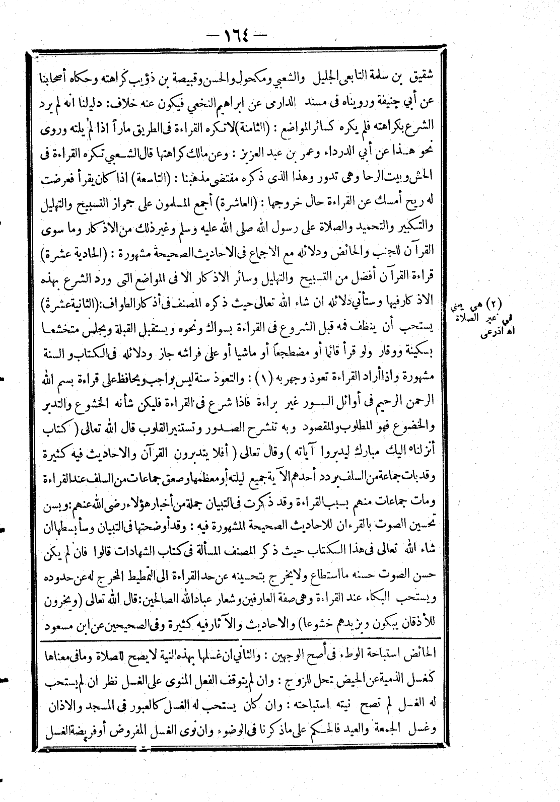 الحائض استباحة الوطئ في أصح الوجهين: والثاني ان غسلها بهذه النية لا يصح للصلاة وما في معناها كغسل الذمية عن الحيض لتحل للزوج: وان لم يتوقف الفعل المنوي على الغسل نظر ان لم يستحب له الغسل لم تصح نيته استباحته: وان كان يستحب له الغسل كالعبور في المسجد والاذان وغسل الجمعة والعيد فالحكم على ما ذكرنا في الوضوء وان نوى الغسل المفروض أو فريضة الغسل