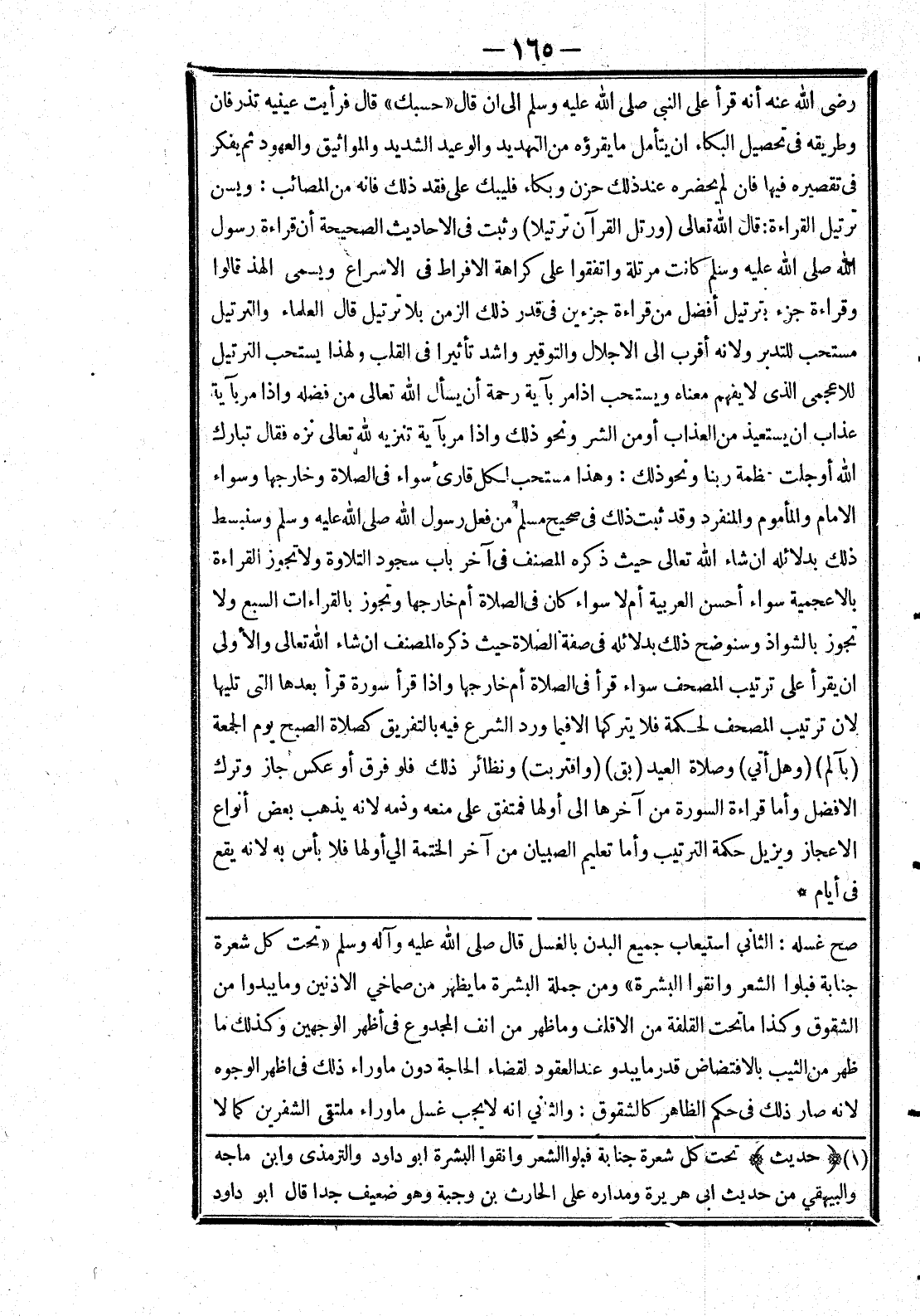 [صح غسله: الثاني استيعاب جميع البدن بالغسل قال صلى الله عليه وسلم (تحت كل شعرة جنابة فبلوا الشعر وانقوا البشرة) ومن جملة البشرة ما يظهر من صماخي الاذنين وما يبدوا من الشقوق وكذا ما تحت القلفة من الاقلف وما ظهر من انف المجدوع في أظهر الوجهين وكذلك ما ظهر من الثيب بالافتضاض قدر ما يبدو عند العقود لقضاء الحاجة دون ما وراء ذلك في اظهر الوجوه لانه صار ذلك في حكم الظاهر كالشقوق: والثاني انه لا يجب غسل ما وراء ملتقى الشفرين كما لا]