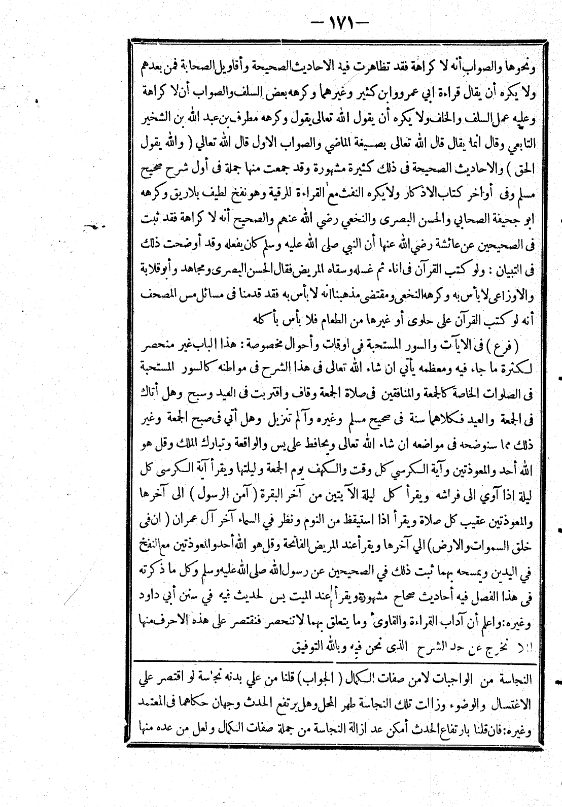 [النجاسة من الواجبات لا من صفات الكمال (الجواب) قلنا من علي بدنه نجاسة لو اقتصر علي الاغتسال والوضوء وزالت تلك النجاسة طهر المحل وهل يرتفع الحدث وجهان حكاهما في المعتمد وغيره: فان قلنا بارتفاع الحدث أمكن عد ازالة النجاسة من جملة صفات الكمال ولعل من عده منها]