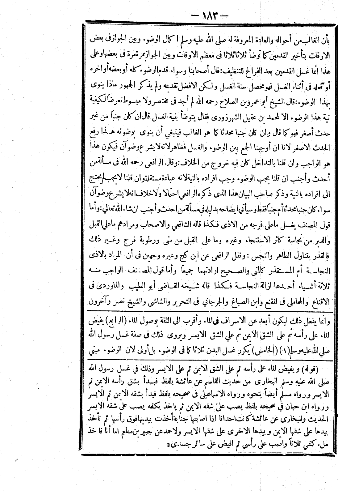 [وانما يفعل ذلك ليكون أبعد عن الاسراف في الماء وأقرب إلى الثقة بوصول الماء (الرابع) يفيض الماء على رأسه ثم على الشق الايمن ثم علي الشق الايسر ويروى ذلك في صفة غسل رسول الله صلي الله عليه وسلم (الخامس) يكرر غسل البدن ثلاثا كما في الوضوء بل أولى لان الوضوء مبني]