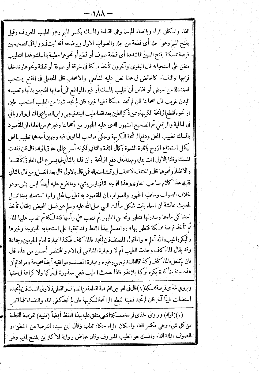 [ويروي خذى فرصة ممسكة قال في العربين الفرصة القطعة من الصوف والقطن فالاولى المسك فان لم تجده استعملت طيبا آخر فان لم تجد فطينا لقطع الرائحة الكريهة فان لم تجد كفي الماء والنفساء كالحائض]