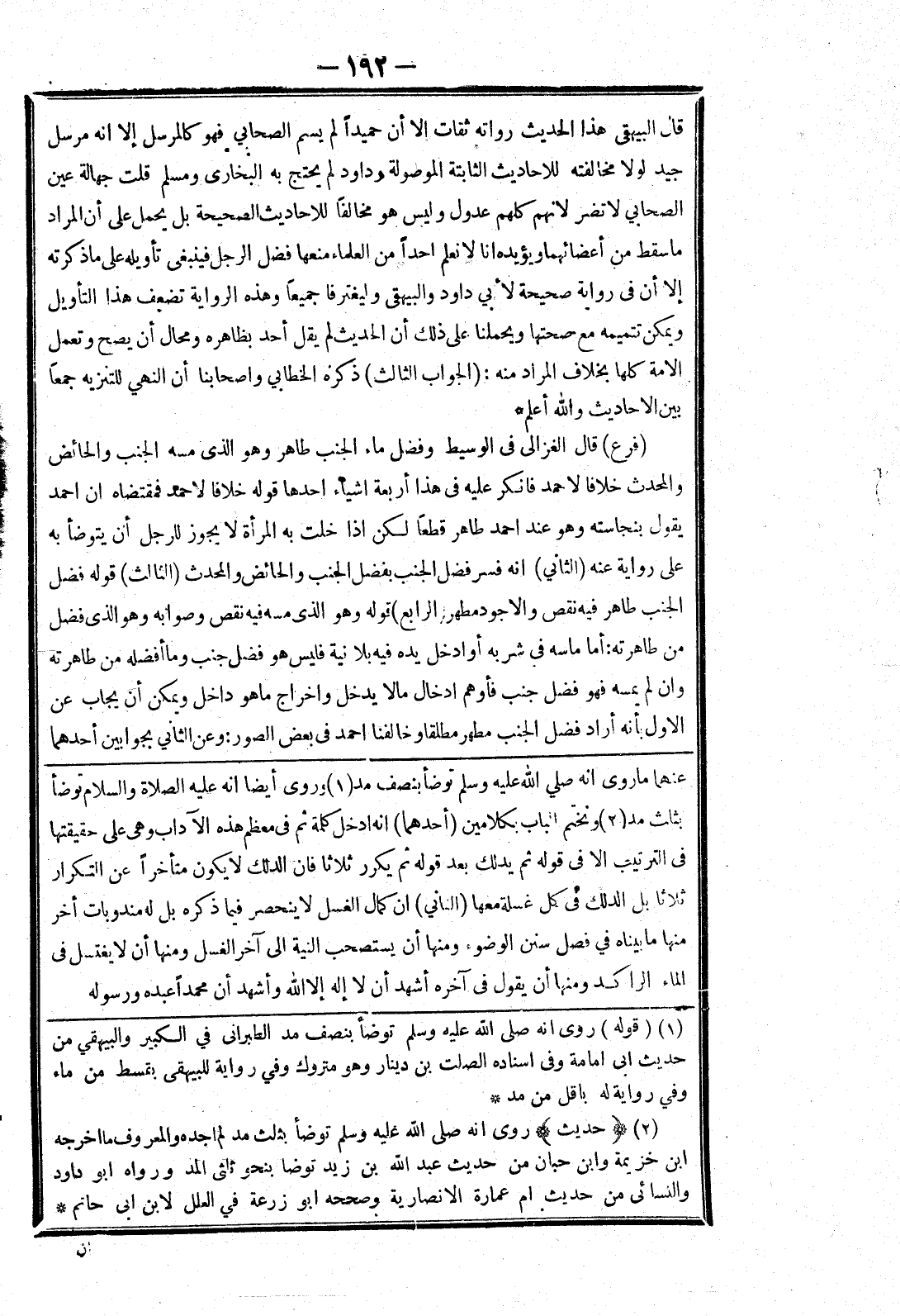 [عنهما ما روى انه صلي الله عليه وسلم توضأ بنصف مد وروى أيضا انه عليه الصلاة والسلام توضأ بثلث مد ونختم الباب بكلامين (أحدهما) انه ادخل كلمة ثم في معظم هذه الآداب وهى على حقيقتها في الترتيب الا في قوله ثم يدلك بعد قوله ثم يكرر ثلاثا فان الدلك لا يكون متأخرا عن التكرار ثلاثا بل الدلك في كل غسلة معها (الثاني) ان كمال الغسل لا ينحصر فيما ذكره بل له مندوبات أخر منها ما بيناه في فصل سنن الوضوء ومنها أن يستصحب النية إلى آخر الغسل ومنها أن لا يغتسل في الماء الراكد ومنها أن يقول في آخره أشهد أن لا إله إلا الله وأشهد أن محمدا عبده ورسوله]
